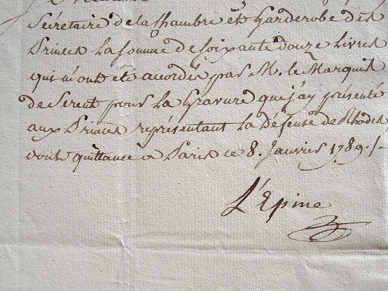 Le graveur C. Lépine (mort en 1808, surtout actif à l'époque révolutionnaire), reconnaît avoir reçu de M. Forqueray, secrétaire de la chambre et garde-robe des princes, la somme de 72 livres : «qui m'ont été accordés par S.M. le Marquis de Serent pour la gravure que j'ay présentée aux Princes représentant la Défense de Rhodes».