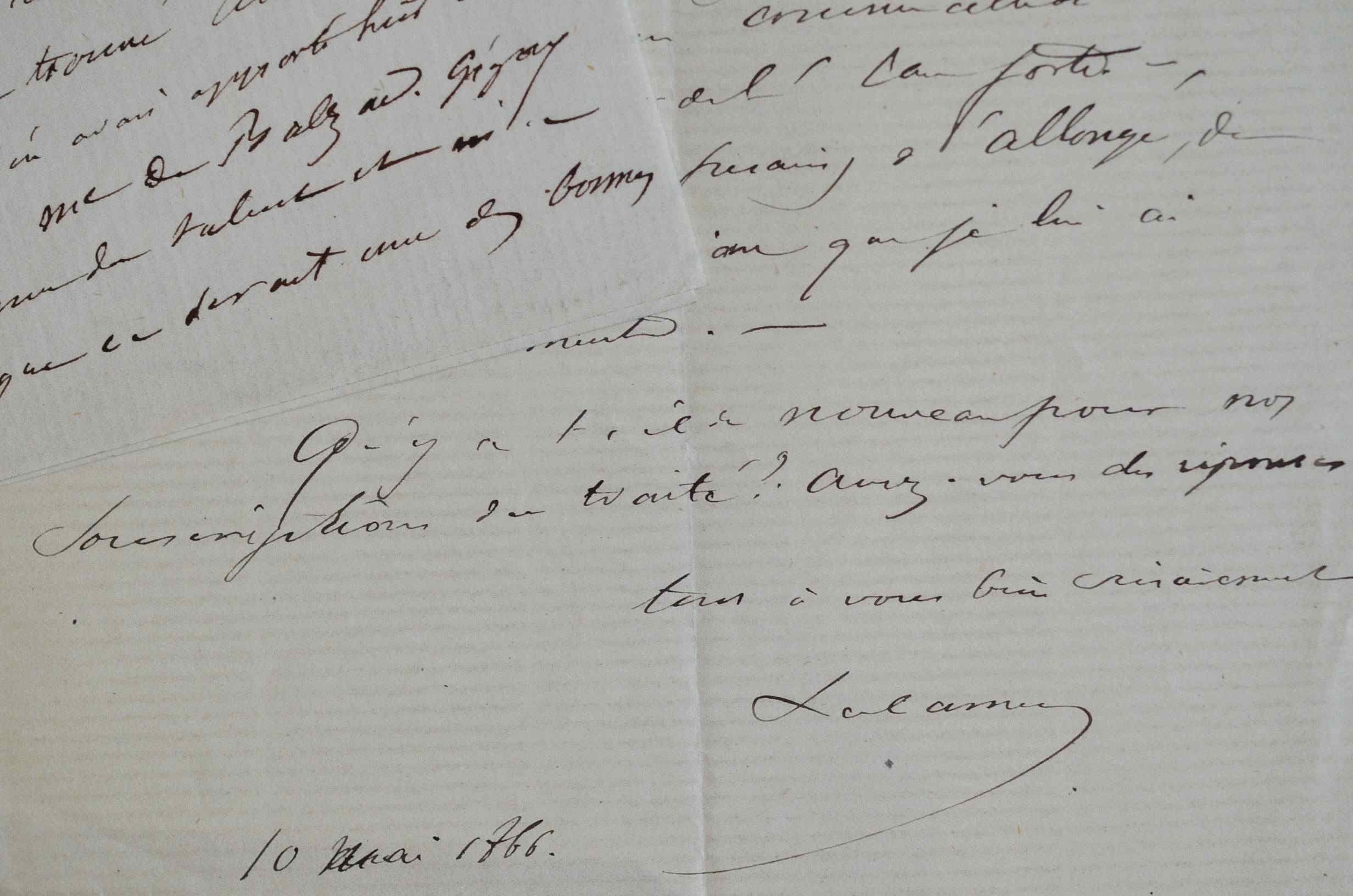 Maxime Lalanne (Bordeaux, 1827/1886)Dans une première lettre, le graveur Maxime Lalanne évoque ses travaux et invite le journaliste Albert de la Fizelière à venir les voir. D'ailleurs, son collègue, le peintre d'histoire Jean Gigoux, les apprécie beaucoup. Ce dernier vit avec la veuve d'Honoré de Balzac : «Gigoux a trouvé cette eau-forte très bonne, j'en avais apporté hier une épreuve chez Mme de Balzac. Gigoux y a reconnu le talent et m'a bien dit que ce devrait être une des bonnes de la collection, qu'il ne s'attendait pas à voir ça.» Lalanne devait représenter le parc de Mme de Balzac, un fusain désormais conservé au Musée des Beaux-Arts de Bordeaux. Dans la seconde lettre, de 1866, Lalanne remercie Fizelière pour son article et l'encourage à venir voir l'un de ses dessins exposé chez Benville, chaussée d'Antin. Il évoque également son Traité consacré à l'eau-forte.