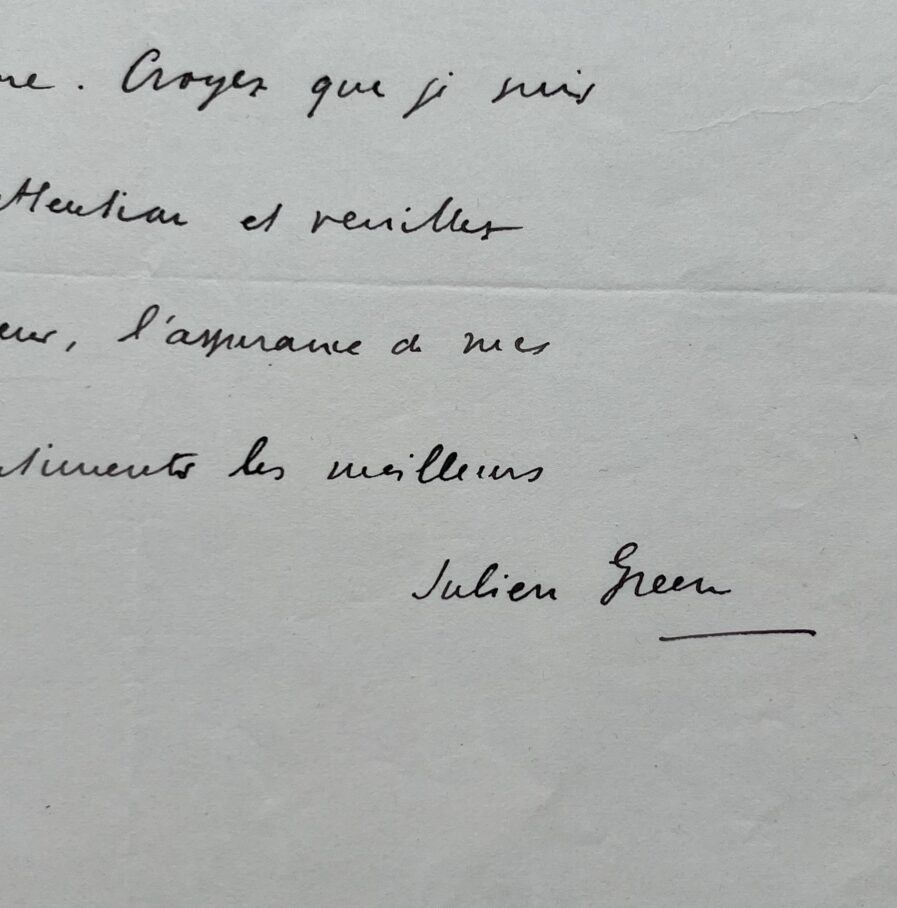 "Cher Monsieur. Je m'excuse de ne pas vous avoir dit plus tôt tout le plaisir que j'ai eu à lire ce que vous avez eu la bonté d'écrire sur mon livre. Croyez que je suis très sensible à votre attention et veuillez agréer, cher Monsieur, l'assurance de mes sentiments les meilleurs. Julien Green".