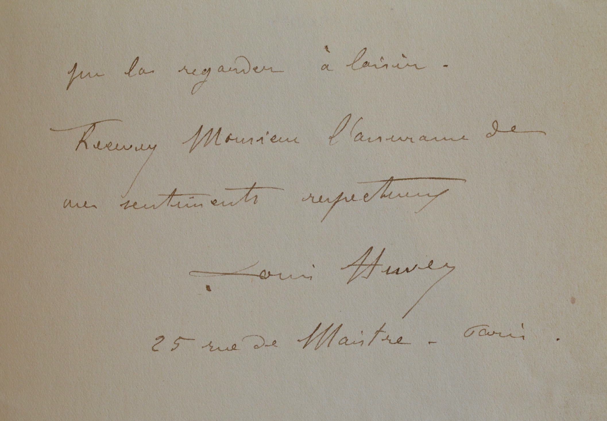 Dans cette lettre enthousiaste, le lithographe Louis Huvey évoque son livre sur Jean-Jacques Henner, «que mon ami Focillon a présenté rapidement à la commission de la Société des Amis des Arts». En effet, Henri Focillon, l'un des historiens de l'art français les plus importants du début du XXe siècle, aidait Huvey à trouver des souscripteurs. Le livre intitulé J. J. Henner et son oeuvre avec vingt lithographies de Louis Huvey parut en 1912 chez Engelmann. Huvey souhaite également rendre visite à son correspondant à Saint-Prix, notamment pour voir «un très beau tableau qui n'est pas connu du Maître regretté A. Maignan». [Albert Maignan, mort à Saint-Prix en 1908, est peintre et illustrateur d'histoire].