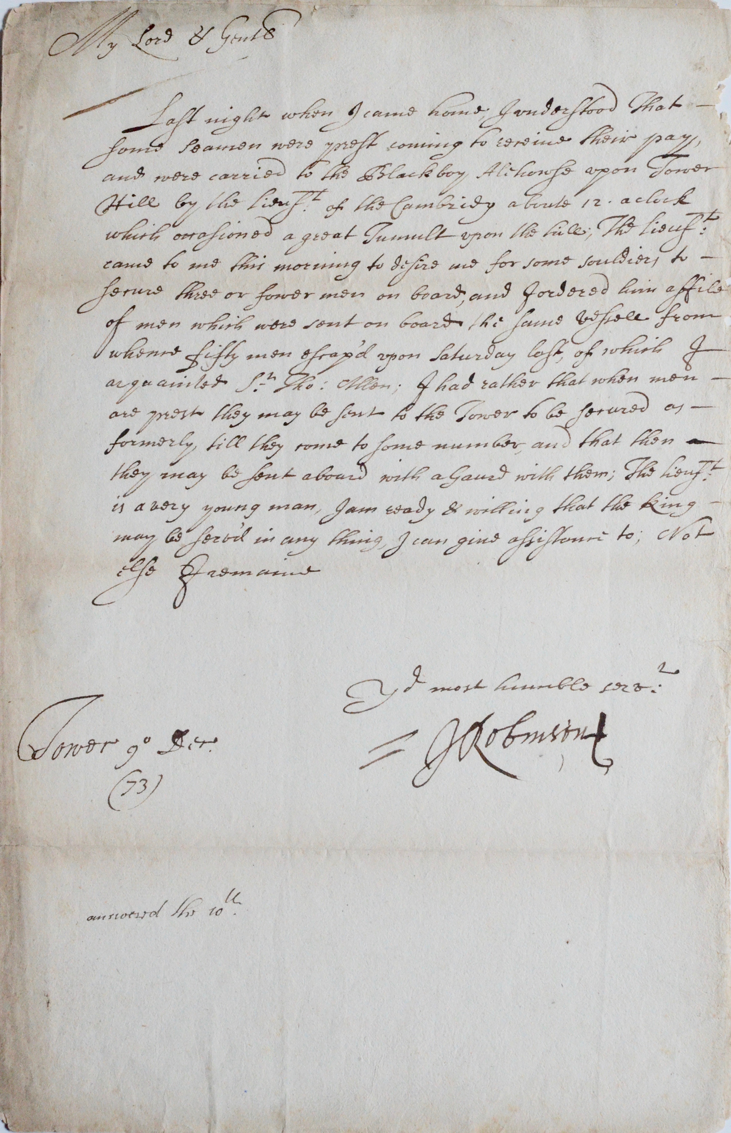 "My Lord & Gentleman. Last night when I came home I understood that some seamen were prost coming to ? their pay and were carried to the Blackboy [?] upon Tower Hill [...] of the Cambridge about 12 o'clock [...] great tumult upon the hill [...]". Il évoque ensuite des soldats, etc.