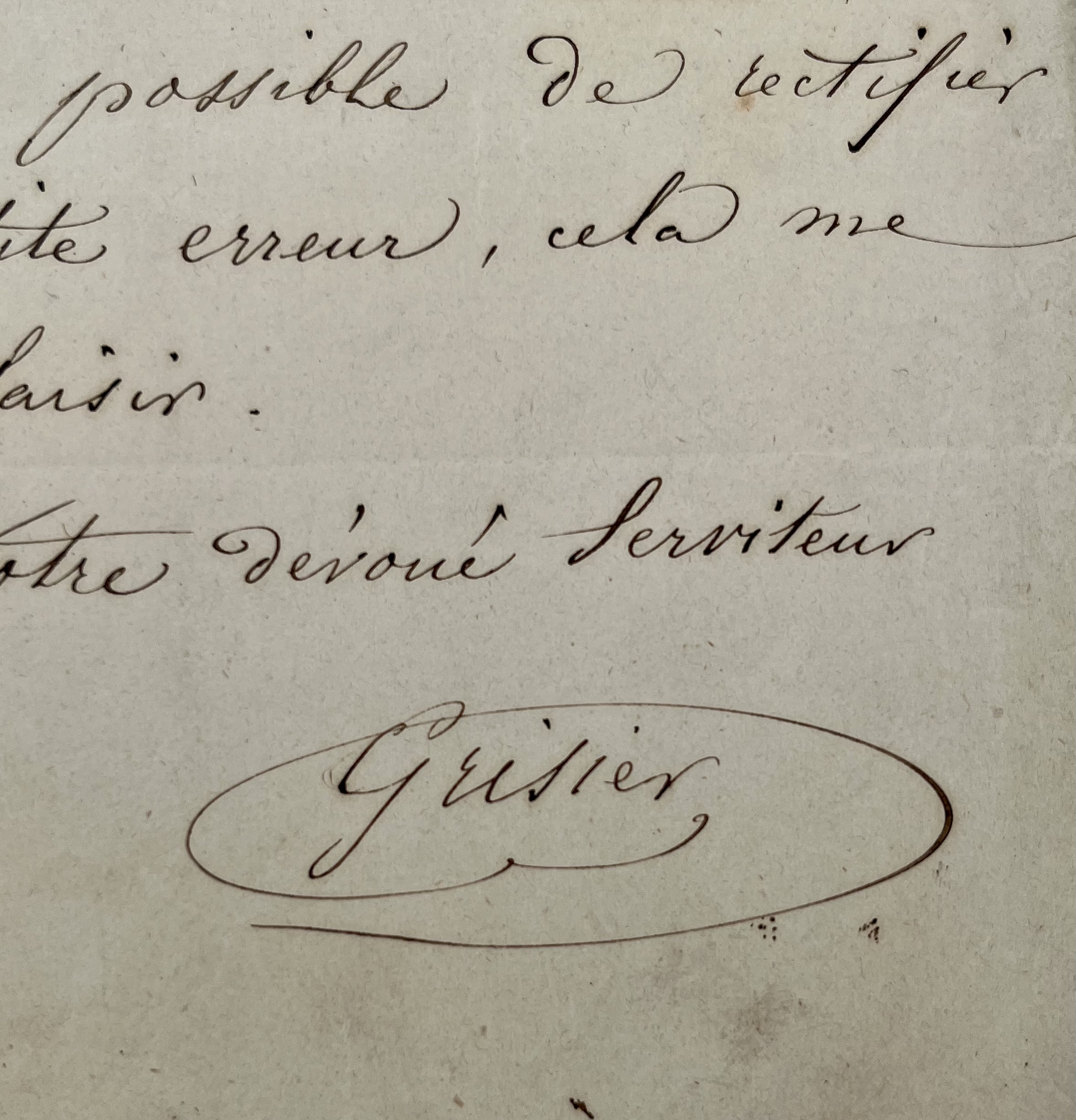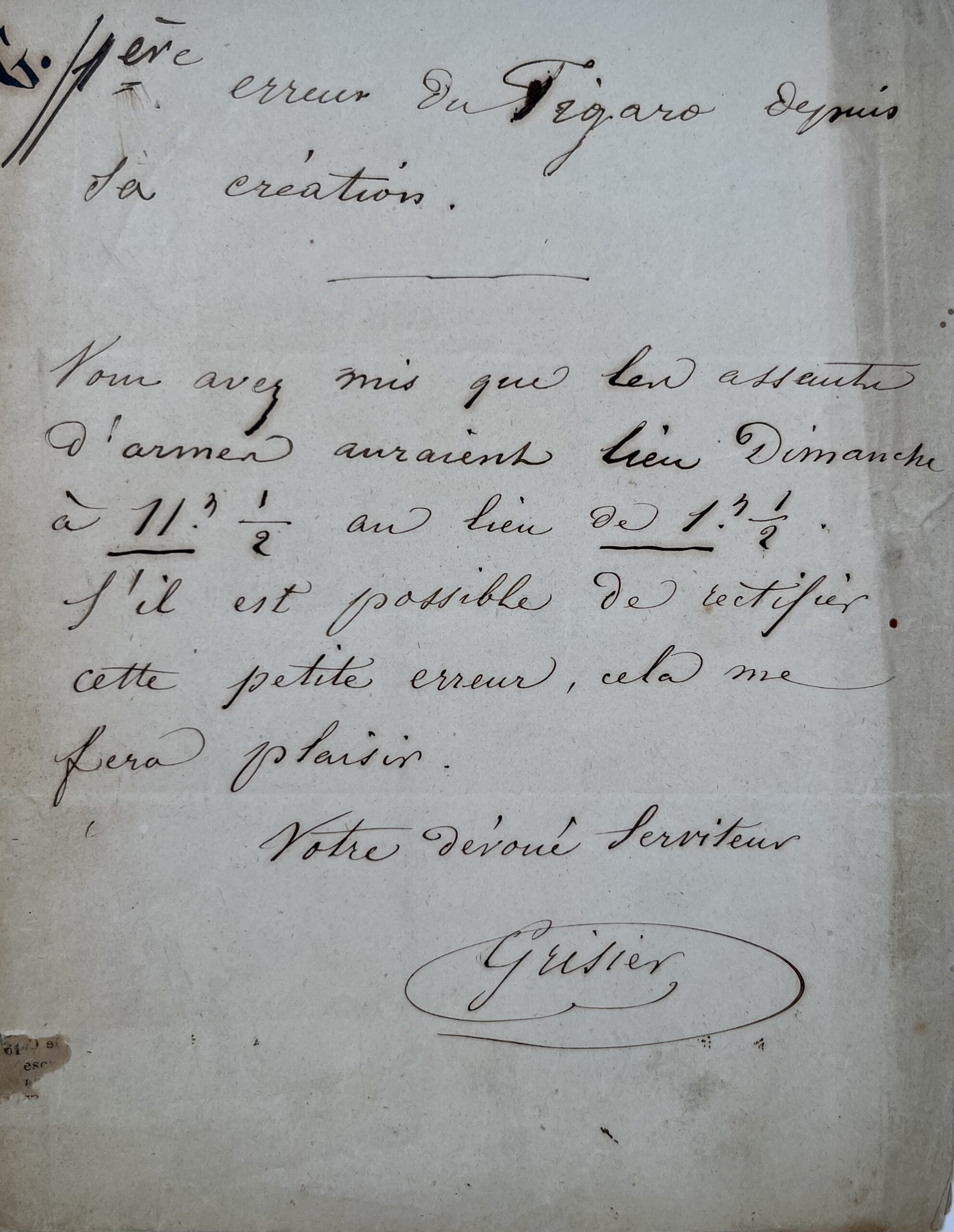 "1ère erreur du Figaro depuis sa création. Vous avez mis que les assauts d'armes auraient lieu dimanche à 11h 1/2 au lieu de 1h 1/2. S'il est possible de rectifier cette petite erreur, cela me fera plaisir. Votre dévoué serviteur. Grisier".