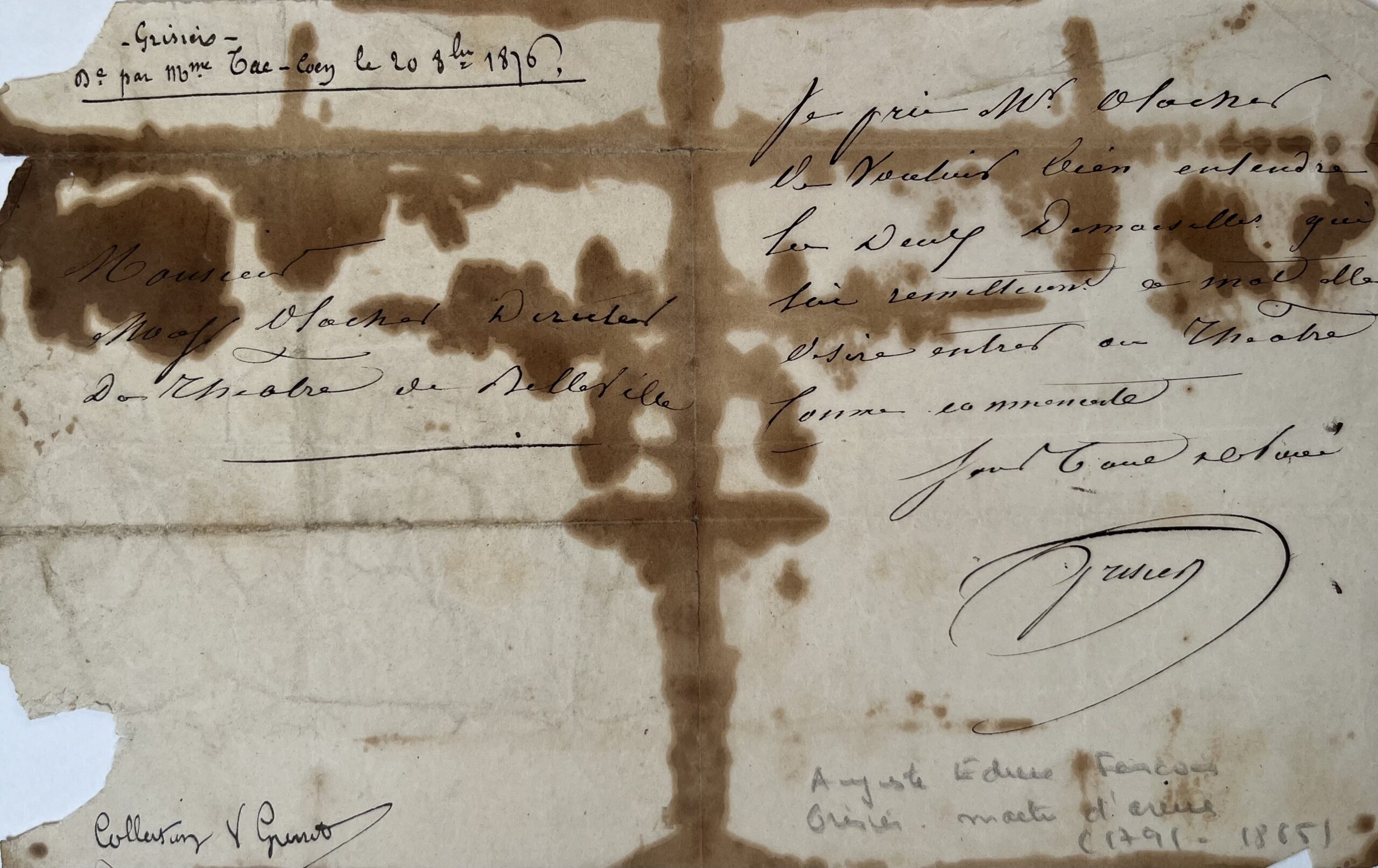 On joint une L.A.S. de Grisier adressée au directeur du Théâtre de Belleville. Il y recommande "deux demoiselles". 1 p. in-12. Fortes taches.
