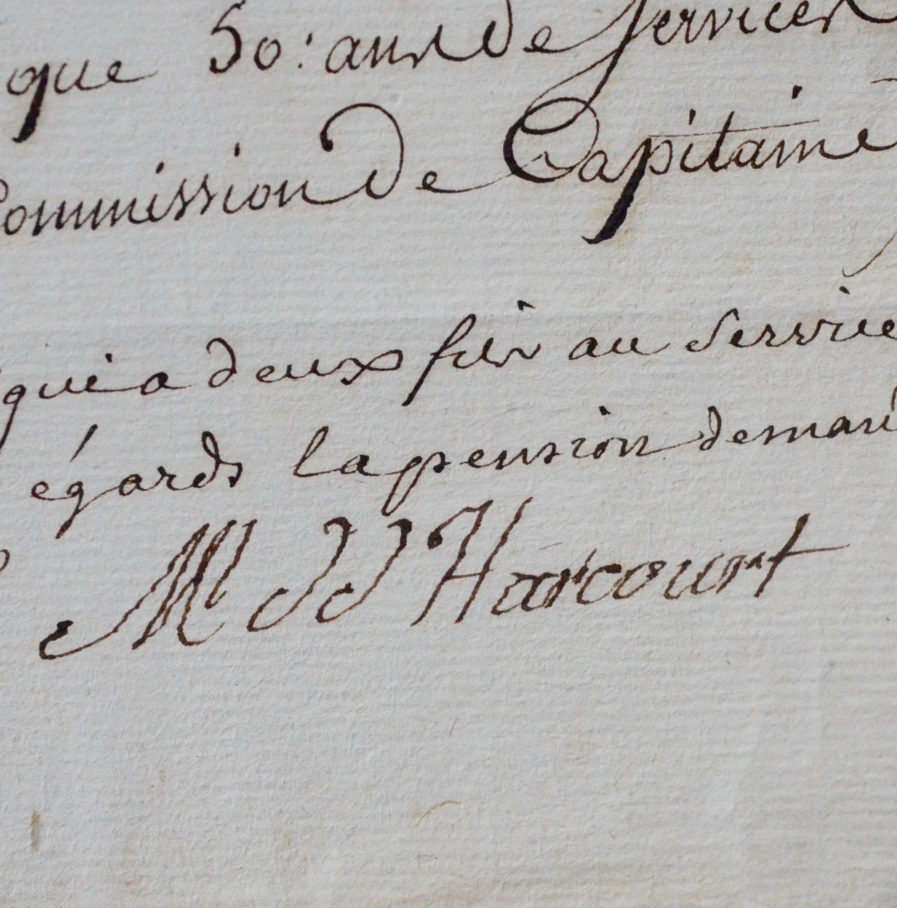 En-tête, d'une autre main : "Joint à la lettre de M. le Mal d'Harcourt du 23 juillet 1781". "A obtenu une augmentation de pension en 400 livres le 28 décembre 1781".
