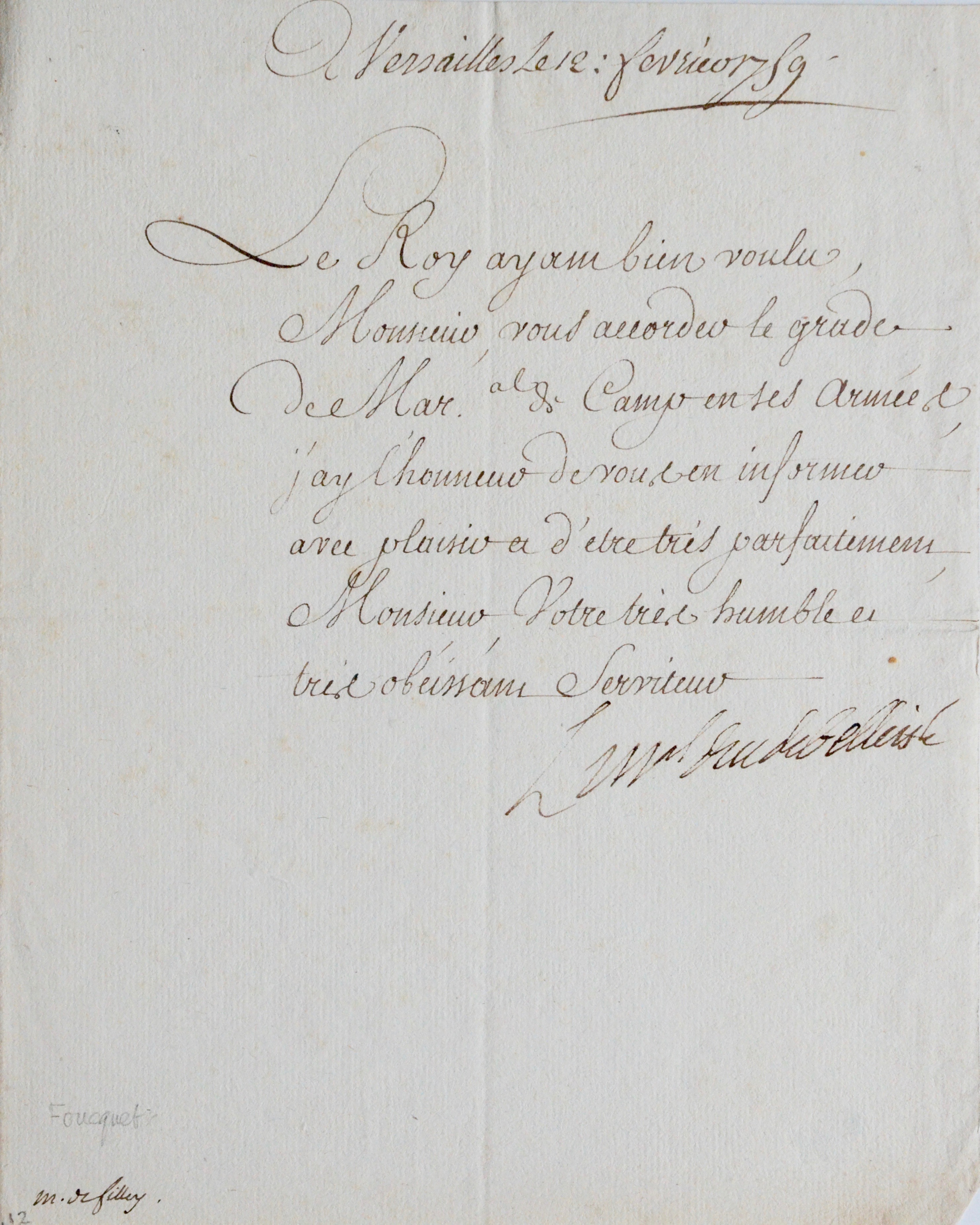 Le Maréchal duc de Belle Isle (1684-1761), annonce à un militaire : M. de Filley, son élévation au grade de maréchal de camp (soit général), suite à une décision du Roi.