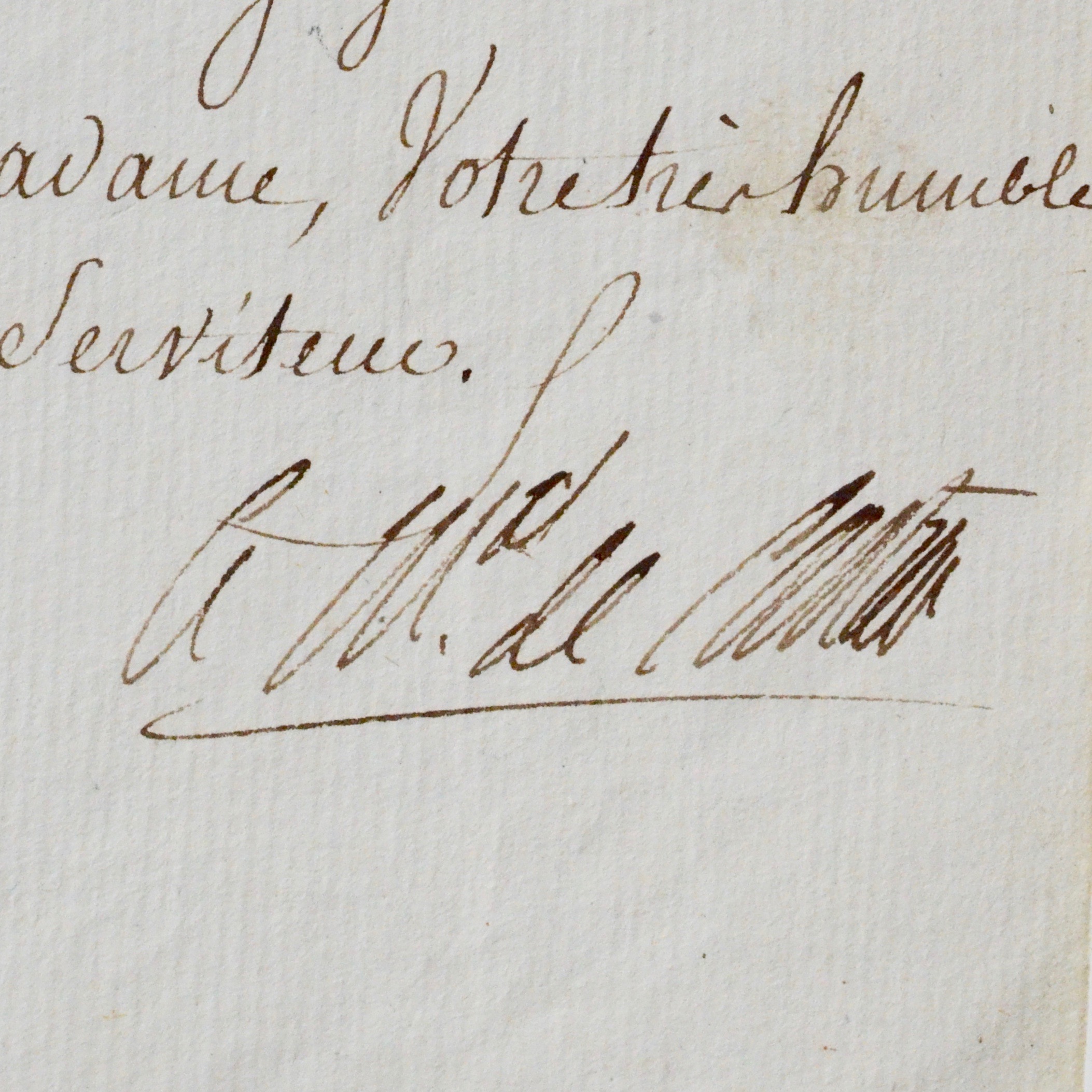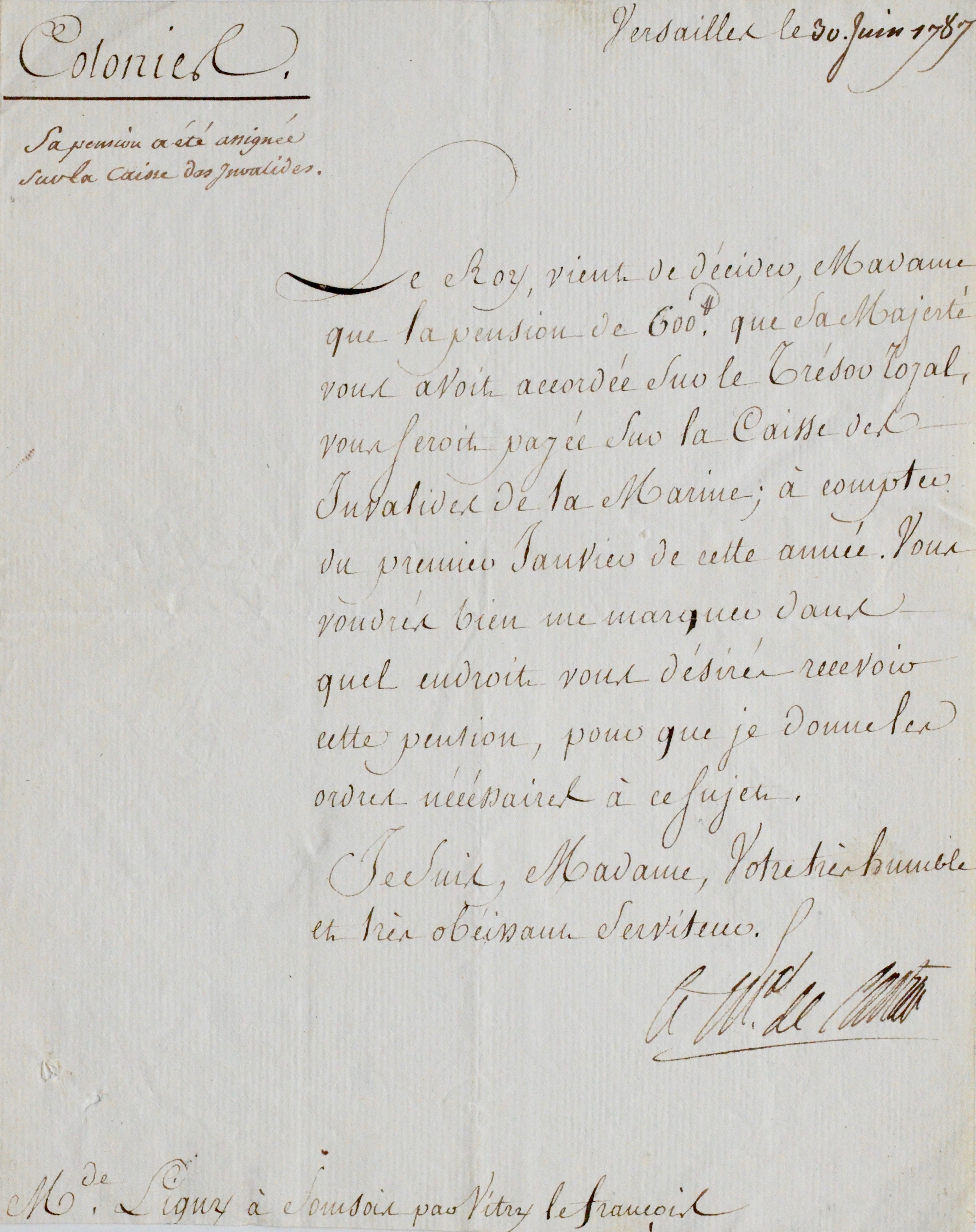 Lettre signée du maréchal de Castries, secrétaire d'État de la Marine et des Colonies de Louis XVI, relative à une pension de 600 livres, accordée sur le Trésor Royal à la veuve d'un militaire de Somsois près de Vitry-le-François, et payée sur la caisse des Invalides de la Marine. Il ajoute "Vous voudrez bien me marquer dans quel endroit vous désirez recevoir cette pension, pour que je donne les ordres nécessaires à ce sujet [...]".