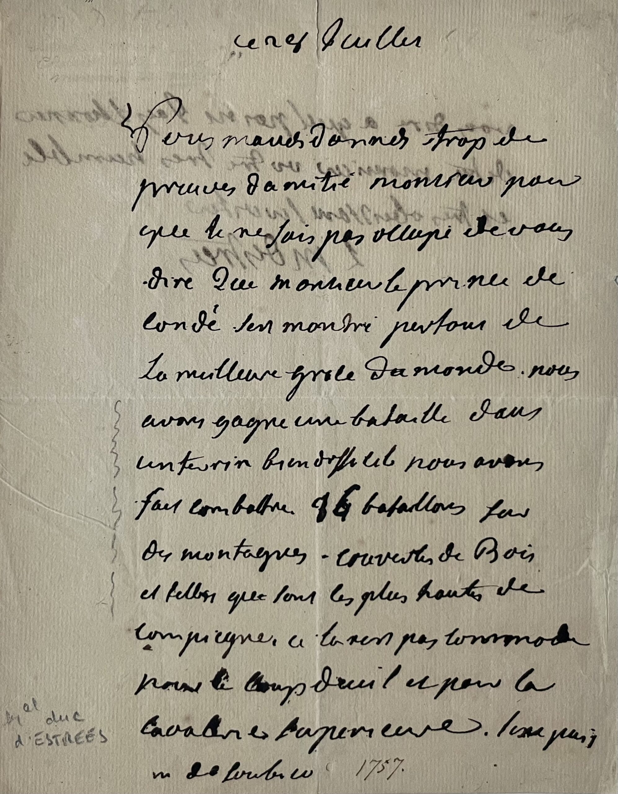 Louis Charles César Le Tellier, duc d'Estrées (1695/1771)Intéressante lettre du maréchal d'Estrées informant le prince de Soubise des premiers exploits militaires du jeune prince de Condé (Louis V Joseph), dont il était le beau-père.