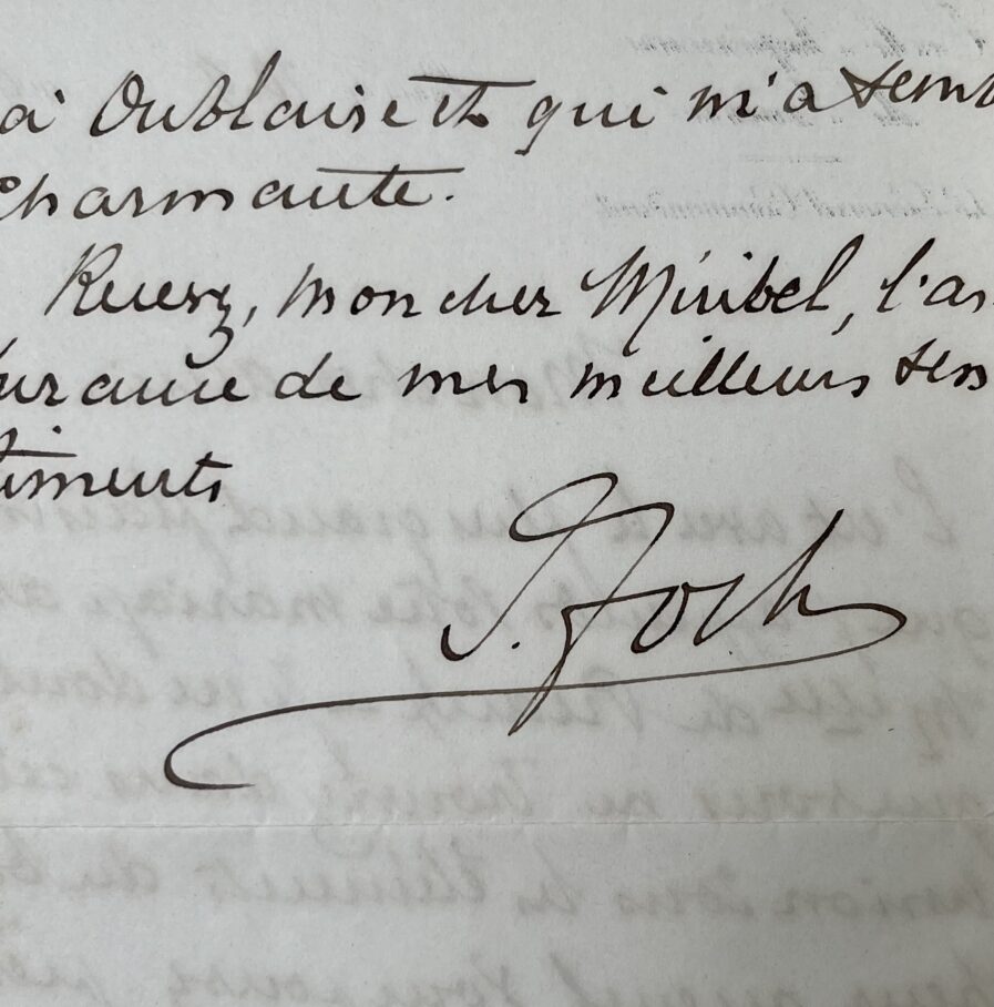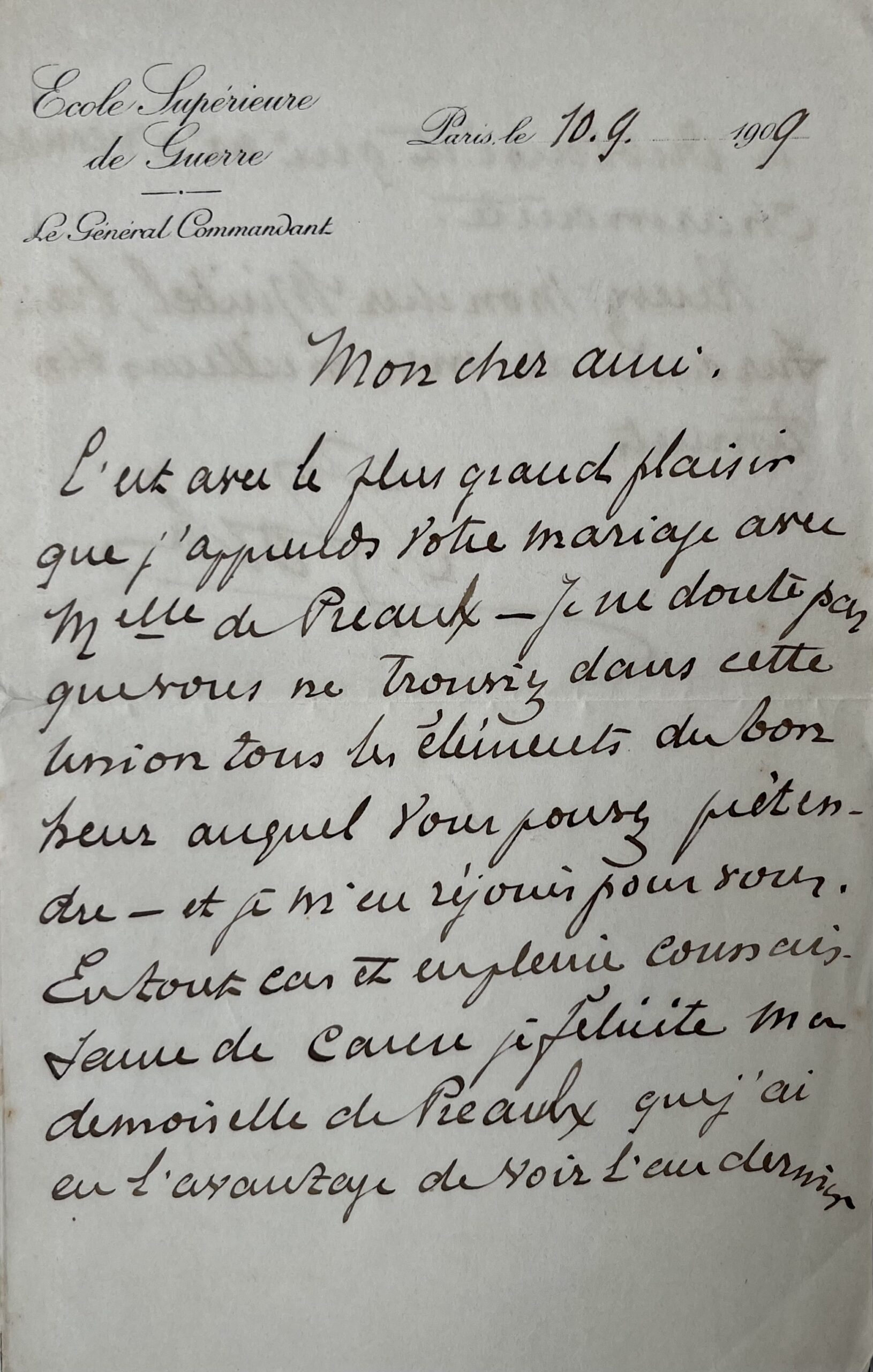 "Mon cher ami, c’est avec le plus grand plaisir que j’apprends votre mariage avec Melle de Preaulx. Je ne doute pas que vous ne trouviez dans cette union tous les éléments du bonheur auquel vous pouvez prétendre - et je m’en réjouis pour vous. En tout cas est en pleine connaissance de cause, je félicite mademoiselle de Preaulx que j’ai eu l’avantage de voir l’an dernier à Oublaise et qui m’a semblé charmante. Recevez, mon cher Miribel, l’assurance de mes meilleurs sentiments."