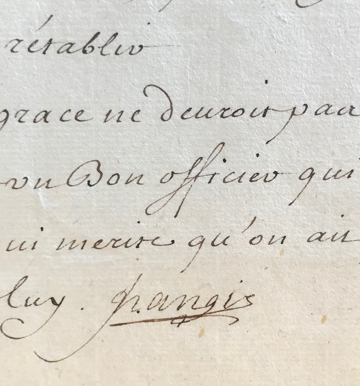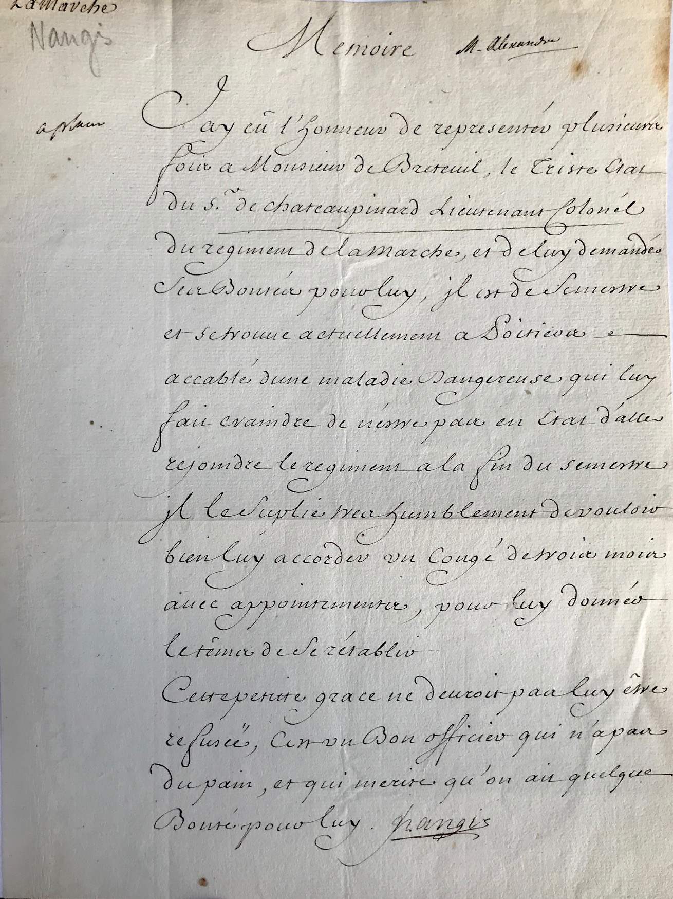 Louis Armand de Brichanteau, marquis de Nangis (1682/1742)Lettre signée de Louis Armand de Brichanteau, marquis de Nangis, maréchal de France. Elle est probablement adressée à François-Victor Le Tonnelier de Breteuil. Il demande un congé de trois mois avec appointements pour donner au lieutenant-colonel, sieur de Chateaupinard, alors à Poitiers "le tems de se rétablir". Chateaupinard était alors « accablée d’une maladie dangereuse qui luy fait craindre de n’estre pas en état d’aller rejoindre le régiment à la fin du semestre. [...] Cette petite grace ne devroit pas lui être refusée, c’est un bon officier qui n’a pas du pain, et qui mérite qu’on ait quelque bonté pour luy".