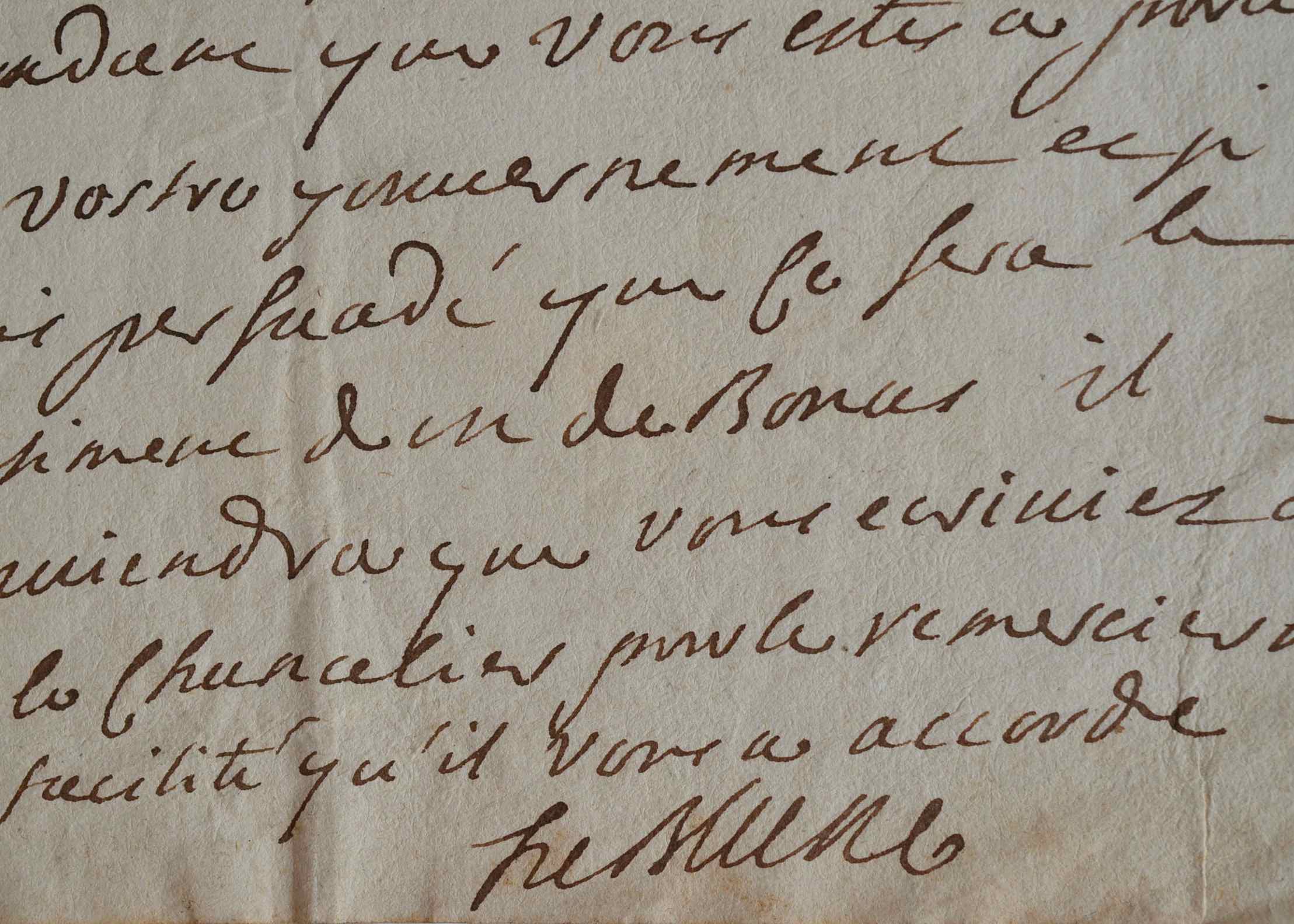 Claude Le Blanc (Paris, 1669/1728)Cette lettre du ministre de la Guerre, Claude Le Blanc, témoigne des tractations pour l'achat du gouvernement de la Ville de Navarrenx par François Ferrand d'Escotay, marquis d'Avernes : « Mons[ieur] le Chancelier ayant subdélégué M. de Lesfeuille pour recevoir, Monsieur, le serment que vous auriez deu prester entre ses mains à cause de vostre gouvernement de Navarrins, je luy en envoye l'expédition dans le paquet que j'ay l'honneur de vous adresser, afin que vous puissiés la luy remettre vous mesme.» Claude Le Blanc ajoute de sa main : «J'ay cru qu'il convenoit que cette affaire fust consommée pendant que vous estes à portée de votre gouvernement et je suis persuadé que ce sera le sentiment de M. de Bonas, il conviendra que vous écriviez à M. le chancelier pour le remercier de la facilité qu'il vous a accordé». [Le marquis d'Avernes déboursa en effet 80 000 livres pour acheter le gouvernement de Navarrenx en Béarn].