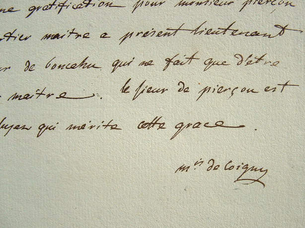 Le marquis de Coigny demande une gratification pour M. Pierçon «cy-devant quartier maître, à présent lieutenant au lieu du sieur de Bouchu qui ne fait que d'être nommé quartier maître. Le sieur de Pierçon est un fort bon sujet qui mérite cette grace».