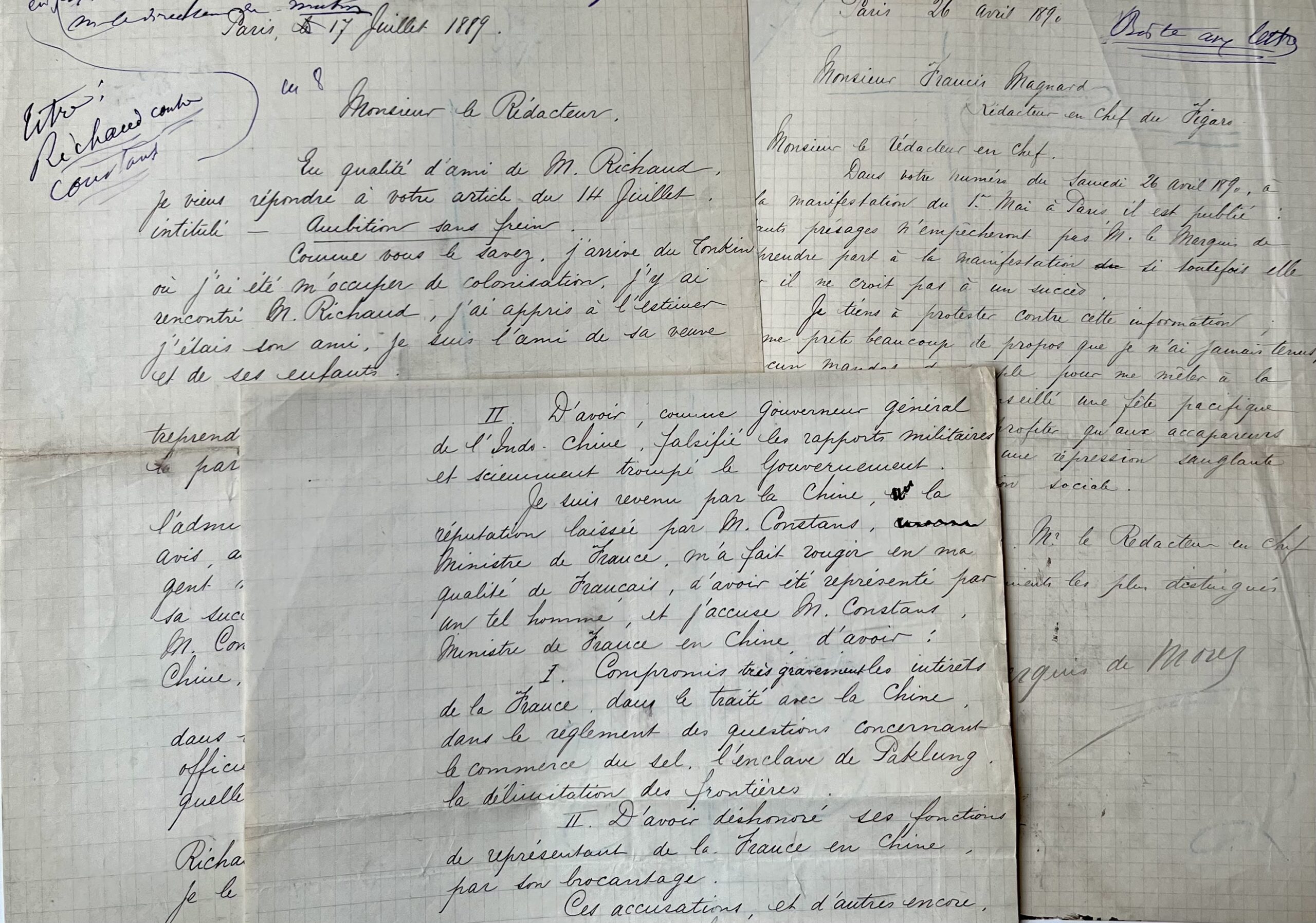 "Monsieur le Rédacteur, en qualité d’ami de M. Richaud, je viens répondre à votre article du 14 juillet, intitulé - Ambition sans frein. Comme vous le savez, j’arrive du Tonkin où j’ai été m’occuper de colonisation, j’ai rencontré M. Richaud, j’ai appris à l’estimer, j’étais son ami, je suis l'ami de sa veuve et de ses enfants. Vous avez eu le grand courage d’entreprendre la défense de M. Constans, je prends la parole à la place de M. Richaud. J’ai vu au Tonkin les résultats de l’administration de M. Constans, et à mon avis, aucun administrateur honnête et intelligent ne pouvait prendre la responsabilité de sa succession. Pour ma part, j’accuse M. Constans, gouverneur général de l’Indochine, d’avoir :