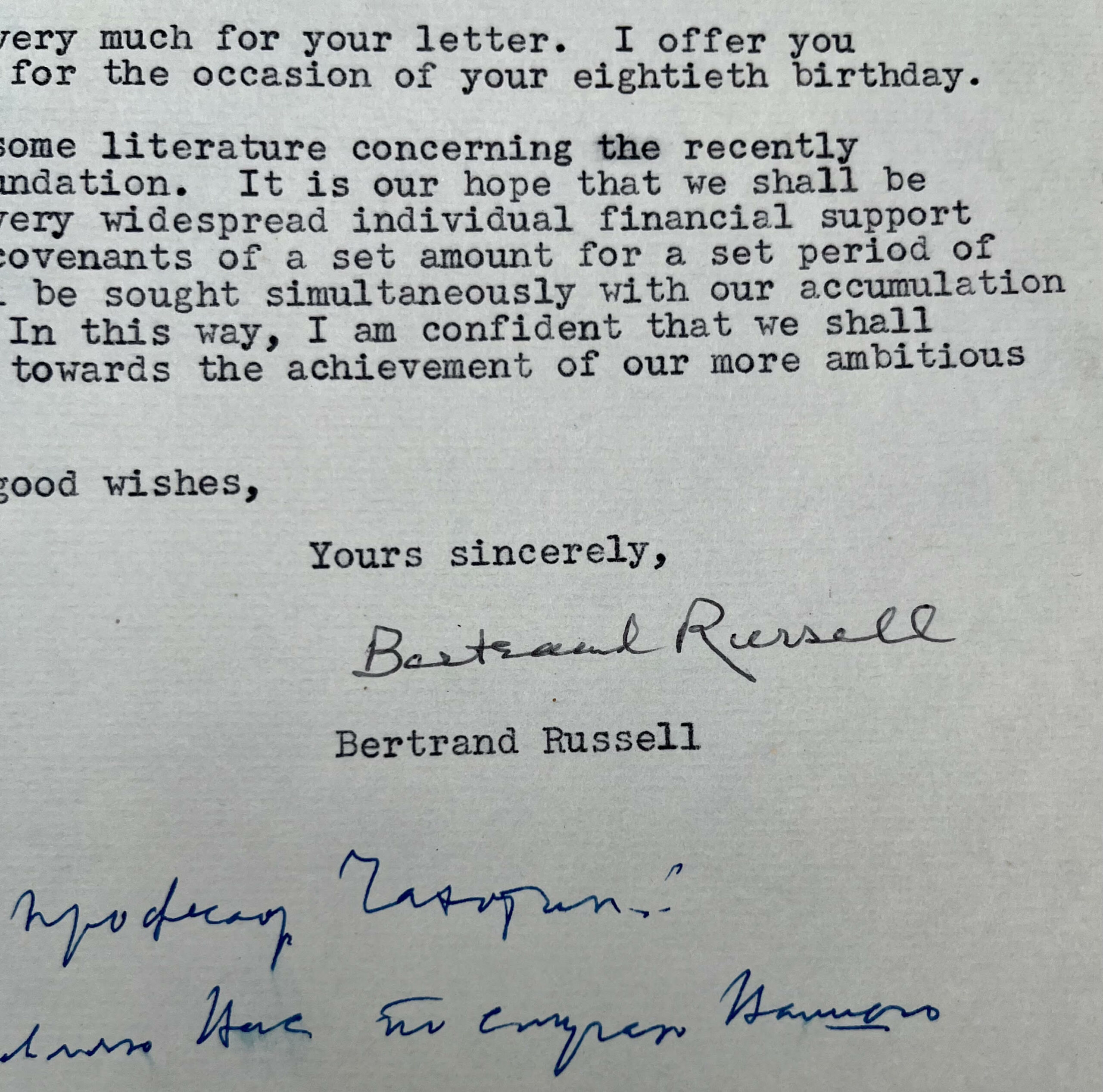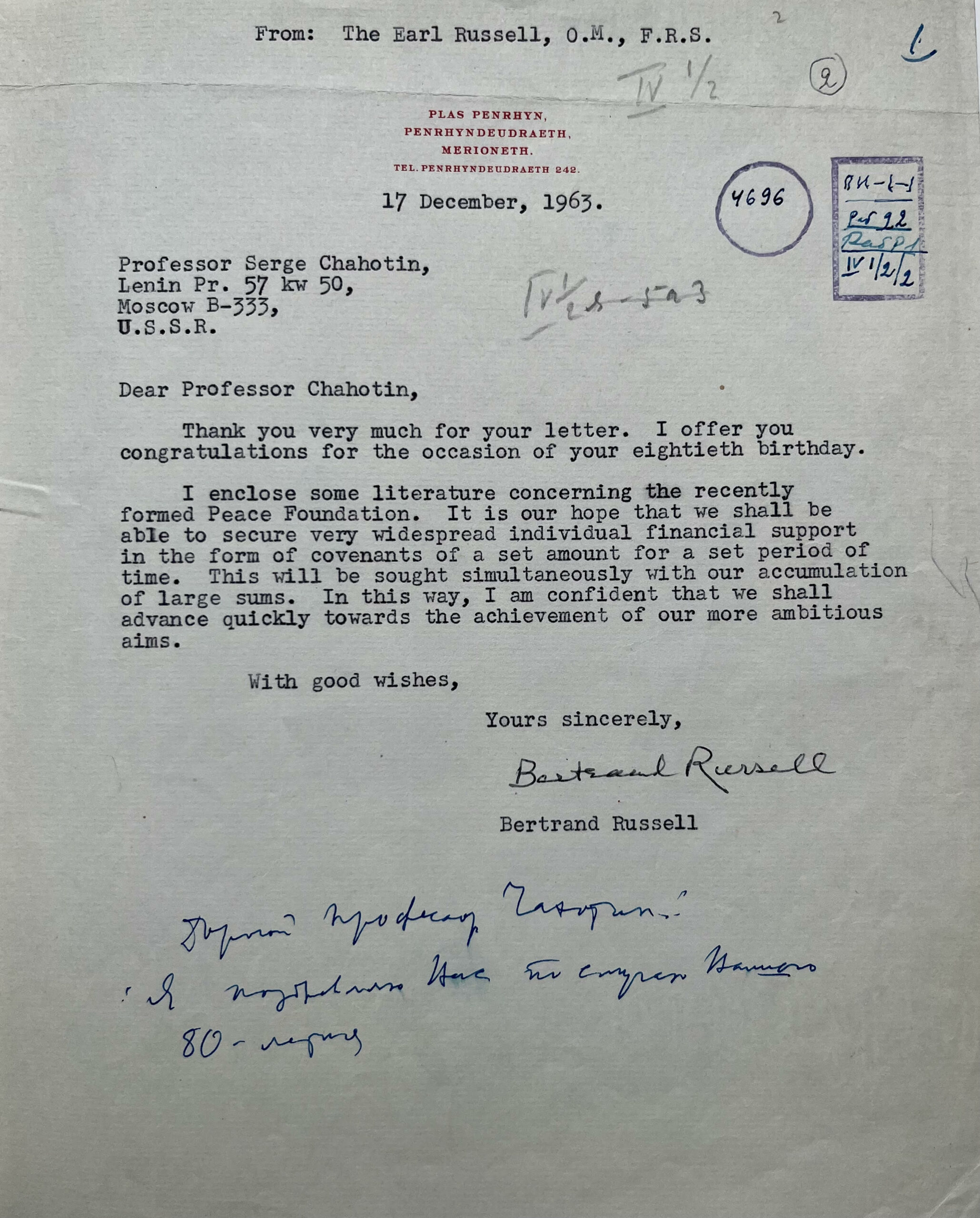 Transcription : "Dear Professor Chahotin. Thank you very much for your letter. I offer you congratulations for the occasion of your eightieth birthday. I enclose some literature concerning the recently formed Peace Foundation. It is our hope that we shall be able to secure very widespread individual financial support in the form of covenants of a set amount for a set period of time. This will be sought simultaneously with our accumulation of large sums. In this way, I am confident that we shall advance quickly towards the achievement of our more ambitious aims. With good wishes".