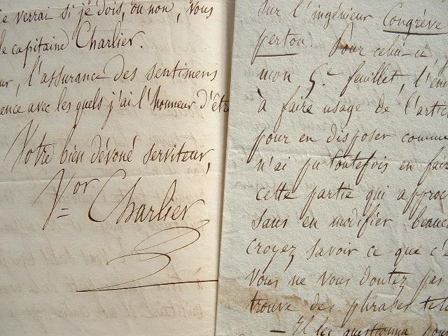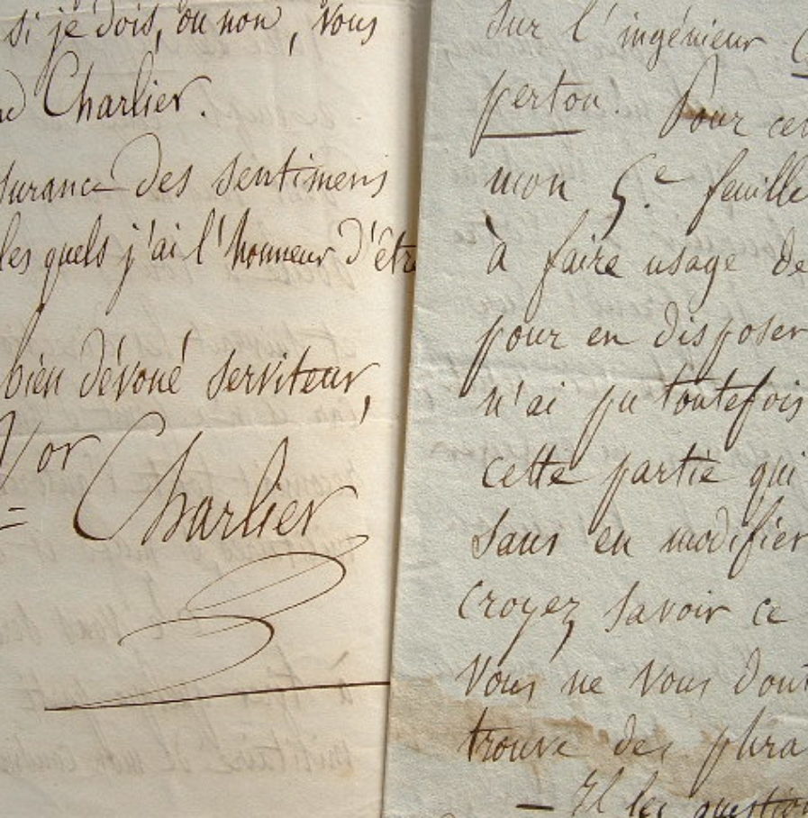 Victor Charlier (Port-Nord-Ouest, 1803/1874)Victor Charlier adresse deux articles qu'il vient de rédiger pour la Biographie universelle, dont un sur le navigateur Clapperton. Il en profite pour mettre les choses au point car cela lui a demandé beaucoup de travail. «Ce qu'il y a de certain, c'est que j'ai trouvé bien pénible de faire cette exploration, dont je me suis acquitté toutefois avec conscience, prenant de cet article tout ce qu'il m'a semblé possible d'en prendre. Je désire bien désormais, et pour plusieurs raisons, qu'aucun malentendu ne m'empêche de faire à moi seul les articles que je me serai chargé, avec votre aveu, de fournir à votre Biographie. C'est pourquoi je prends sur moi de vous désigner, sur une liste ci-jointe, quelques uns de ceux que je pourrais m'engager à donner promptement, pour la livraison même qui est sous presse [...]». Dans une seconde lettre, il vante les qualités de son cousin, le capitaine Charlier, qui désire participer à la rédaction d'articles pour la Biographie universelle.