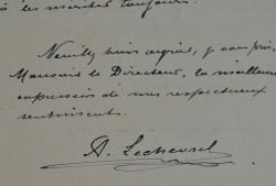 Dans cette lettre, le médailleur Alphonse-Eugène Lechevrel remercie le directeur des Monnaies et Médailles, Alfred de Foville, avec un grand respect : « Très honoré et très sensible aux félicitations que vous venez de m'adresser : je m'empresse de vous remercier bien vivement, et croyez que tous mes efforts tendent à les mériter toujours. » L'on suppose que Lechevrel a réalisé un travail pour les Monnaies.