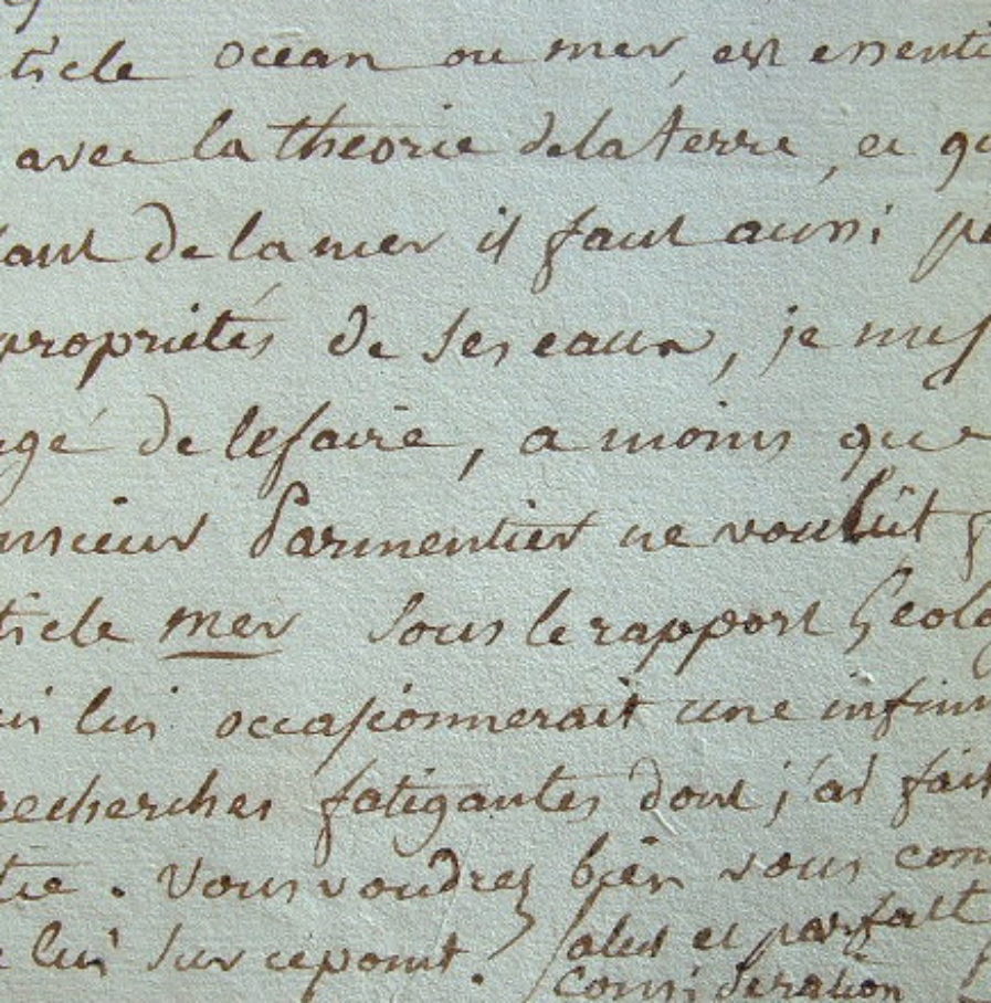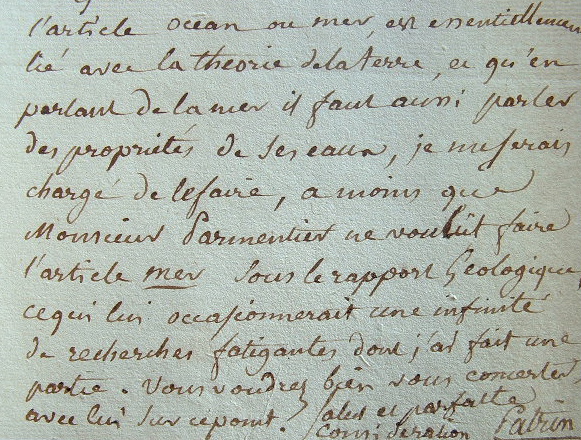 Eugène Louis Melchior Patrin (Mornan (Rhône), 1742/1815)«Comme l'article Eau est naturellement dévolu à la minéralogie et à la géologie, je n'ai pas pu prévoir que monsieur Parmentier voulût s'en occuper. Mais puisque son article est fait, je ne vois point d'autre parti convenable à prendre que de retirer le mien. Quant à l'eau de mer, comme l'article océan ou mer est essentiellement lié à la théorie de la terre, et qu'en parlant de la mer il faut aussi parler des propriétés de ses eaux, je me serais chargé de le faire, à moins que monsieur Parmentier ne voulût faire l'article mer sous le rapport géologique, ce qui lui occasionnerait une infinité de recherches fatigantes dont j'ai fait une partie [...]».