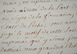 Lettre signée par le comte Pouget, intendant général des classes au ministère de la Marine, chargé de la pêche et de la navigation marchande (en 1789, il fait partie du Conseil de Marine), au sujet de la formation de nouveaux "Etats de pêche". "Vous avez très bien jugé le motif de cette lettre, les imprimés qui y sont joints sont destinés aux grandes pêches principalement, et à mettre de l'uniformité dans l'envoi de ces Etats, mais pour les compléter, vous y joindrez les pêches fraiches, par estimation, et par aperçu seulement, la grande exactitude n'étant point nécessaire et devenant très difficile, d'autant qu'il faut éviter tout ce qui pourrait produire quelque gêne pour les pêcheurs".
