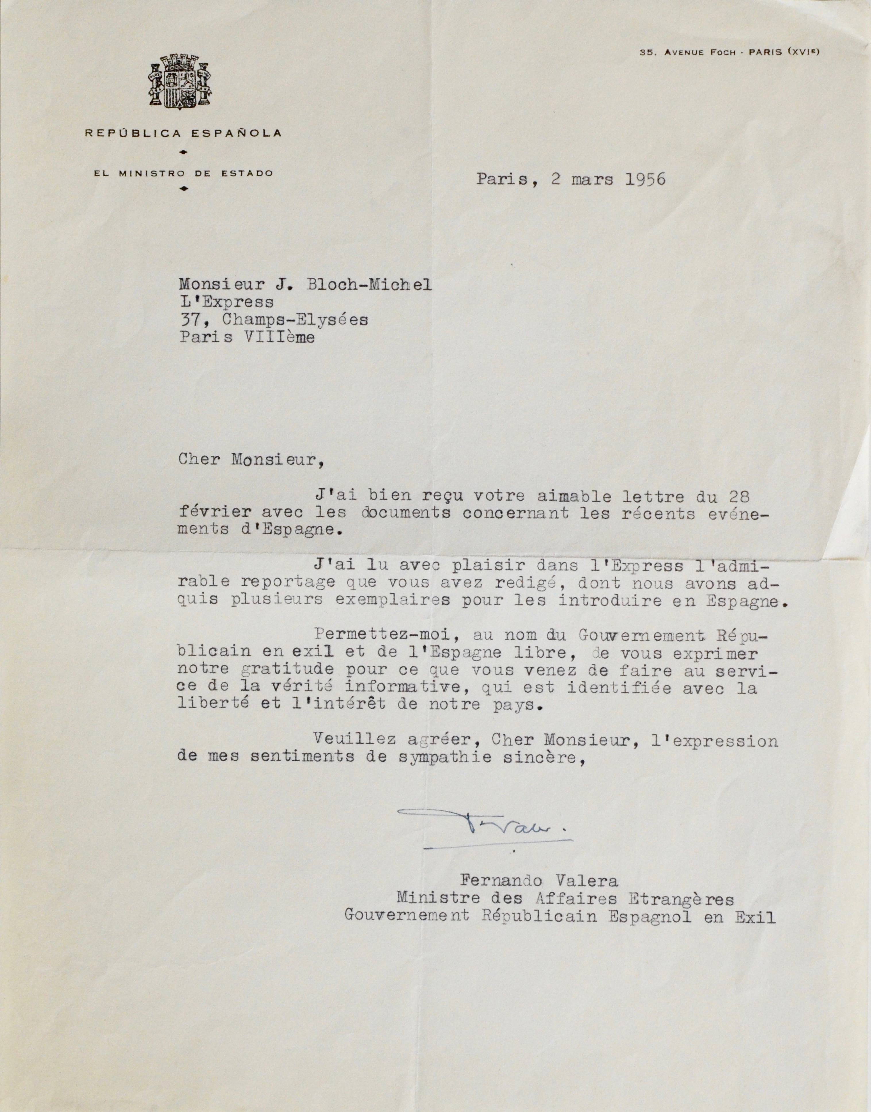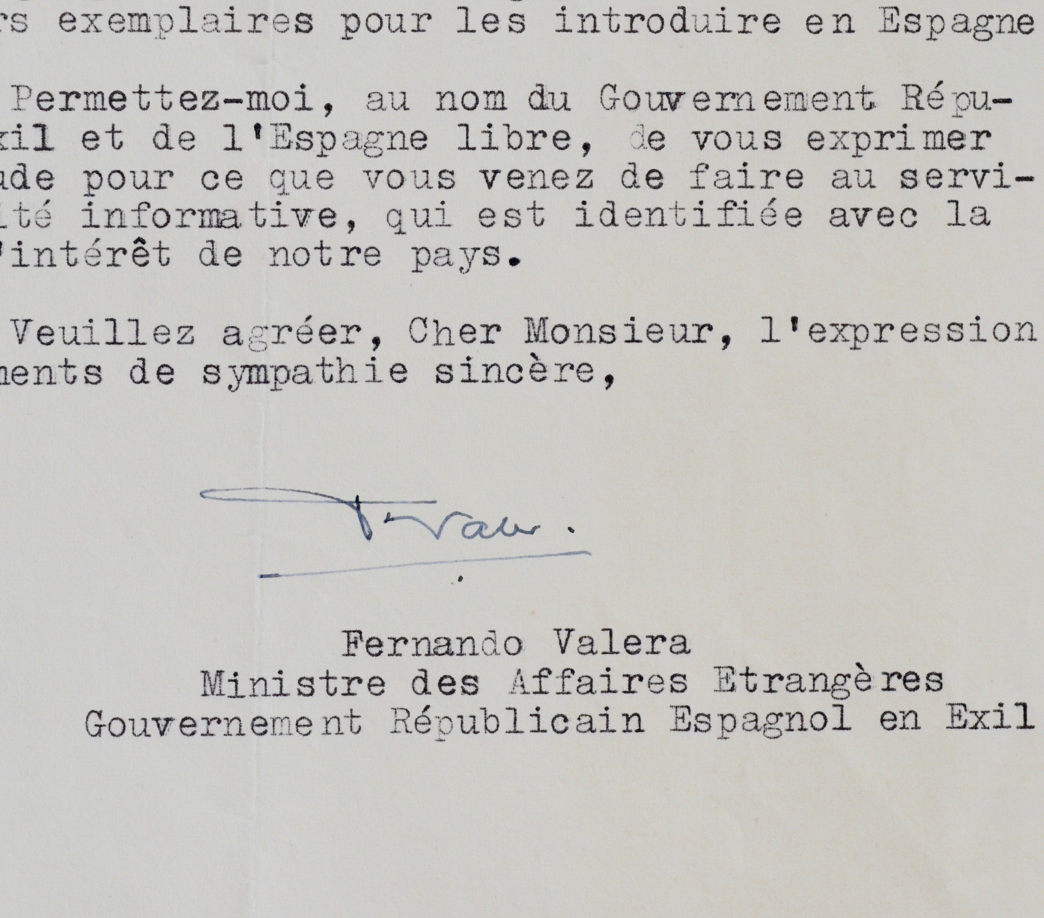Lettre dactylographiée signée du ministre des affaires étrangères espagnol, Fernando Valera, exilé à Paris.