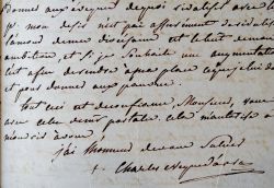 Charles La Tour d'Auvergne-Lauragais (de) (Auzeville-Tolosane, 1768/1851)Belle et intéressante lettre de Mgr de La Tour d'Auvergne-Lauragais, nouvel évêque d'Arras, écrite après le Concordat, qui doit faire face l'hostilité de certaines personnalités en dépit de l'amour que lui porte la population de la ville. Il lui fallut réorganiser un diocèse comptant autant de prêtres réfractaires que de constitutionnels dont il était le plus jeune d'entre eux. "Je ne sais, Monsieur, si Mr Portalis est convaincu que j'ai beaucoup à souffrir à cause du p. Il n'y a de démarches secrètes qu'il ne fasse pour me contrarier. Il semble que ce soit un besoin pour lui de s'opposer à tout ce qui a trait à la religion [...]. Mon succès et le suffrage général que j'ai obtenu sont un crime, on enrage de me voir si généralement aimé. Toute la société des amateurs de la ville m'a donné une sérénade la veille de ma fête (St Charles) et a fait de la musique à l'église le dimanche suivant ; on ne me pardonne pas d'avoir mérité cette galanterie". Il demande l'appui de Portalis et surtout du Premier Consul. "Je ne me plains pas de la ville. J'y suis trop aimé. C'est au point d'être esclave des usages que je me suis imposé, car si je ne parais pas à une grande messe un dimanche, ma porte est assiégée de gens qui me croyaient malade. C'est assurément bien agréable pour moi, mais d'un autre côté, avoir à faire à des gens qui haïssent la religion, et qui ont dit à table, qu'il fallait nous faire faire assez de sottises pour que le gouvernement se repente d'avoir rétabli la religion ; avoir à faire à des personnes qui se conduisent conséquemment à le dire, c'est je l'avoue bien terrible [...]".