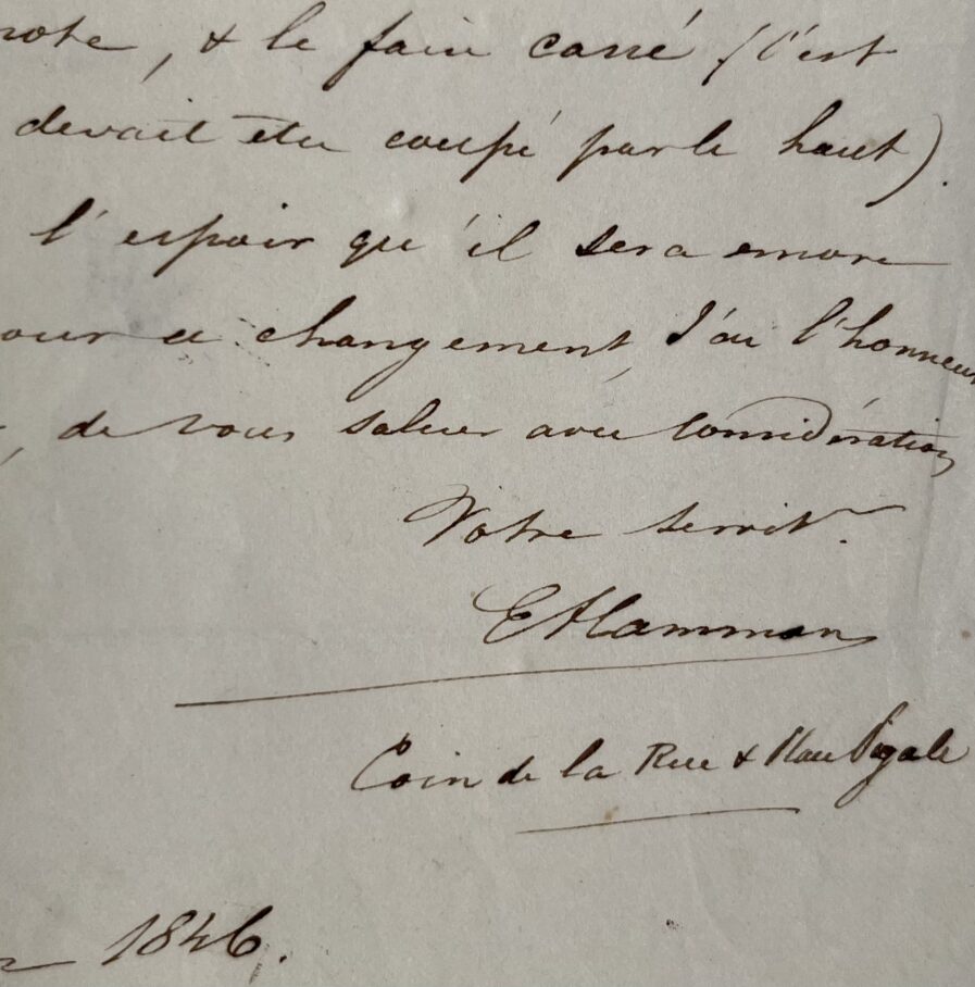 "J'ai réfléchi à la façon du plus grand des deux cadres que vous êtes en train de faire pour moi, & me suis décidé à faire faire ce plus grand des deux tout uniment carré, sans couper aucune espèce de coin. Veuillez donc, je vous prie, en prendre note, & le faire carré (c'est celui qui devait être coupé par le haut). Dans l'espoir qu'il lui sera encore temps pour ce changement [...]".