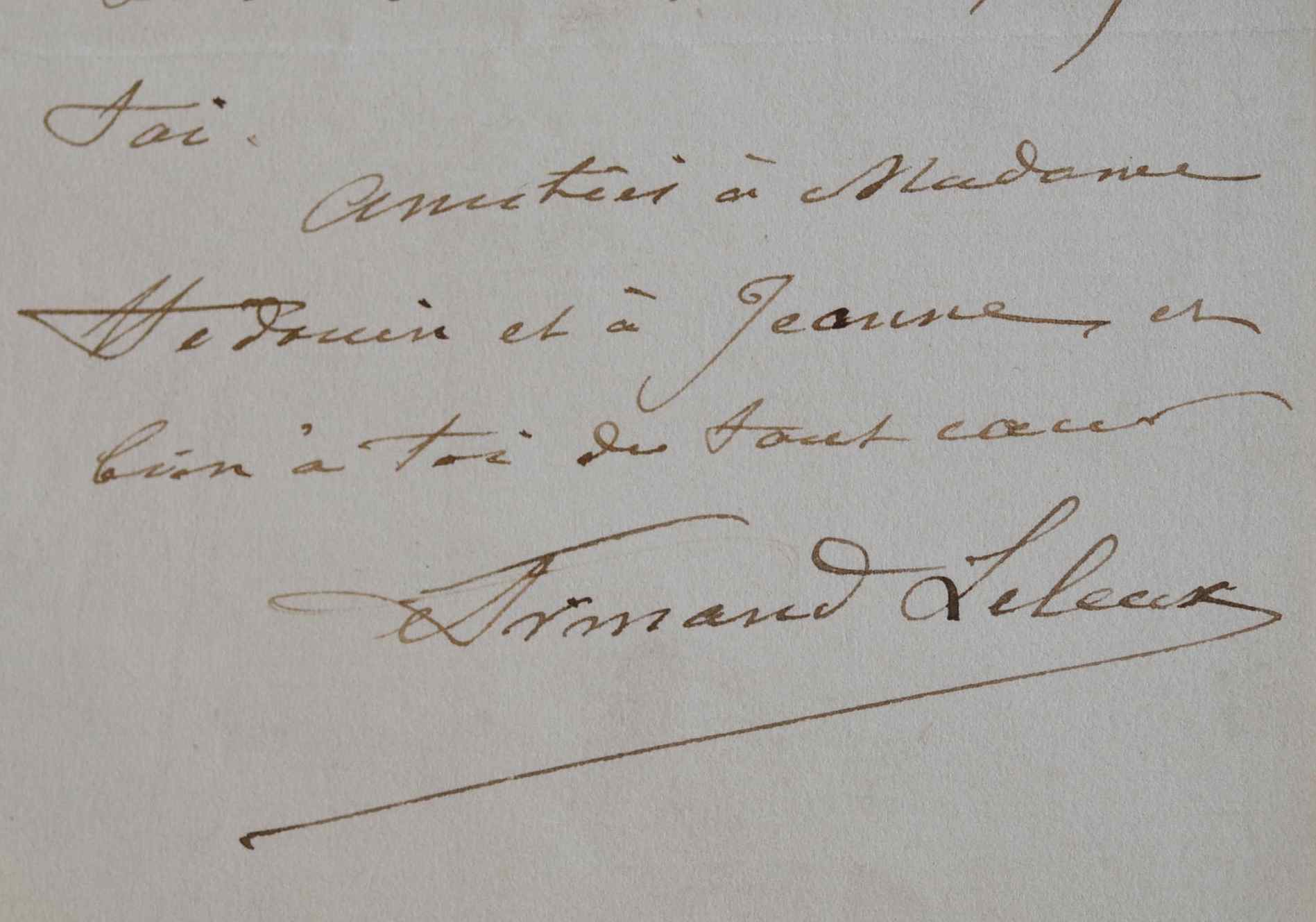 Dans cette lettre amicale, le peintre Armand Leleux informe son confrère Edmond Hédouin qu'il a accédé à sa requête : «Je viens de satisfaire à ton désir en écrivant à Mr. Le Royer. Que ce que tu souhaites s'accomplisse et j'en serai aussi heureux que toi.»