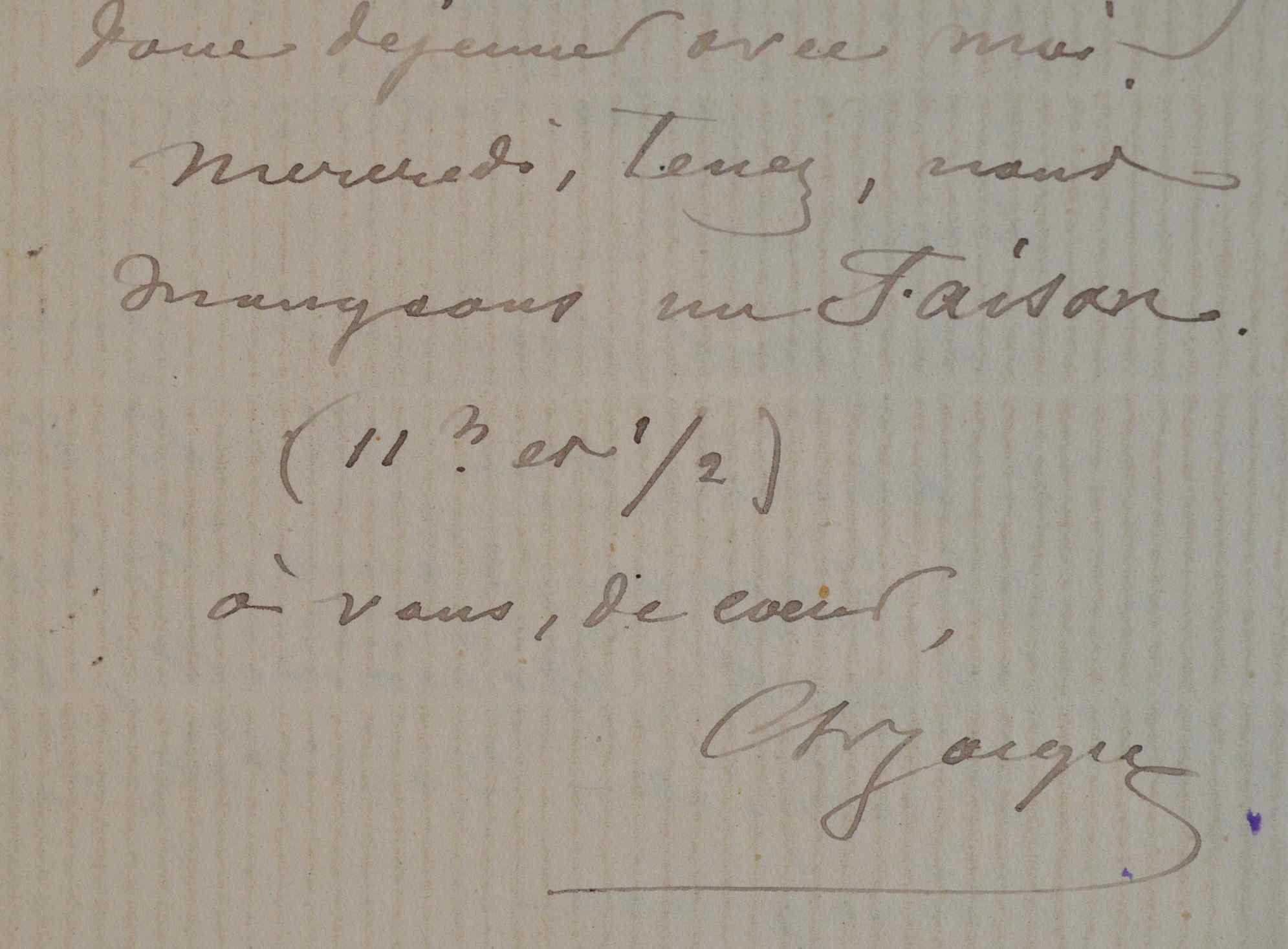 Dans cette lettre, le peintre Charles Jacque souhaite organiser une réunion avec Jules Claretie, suite à un article de ce dernier paru dans Le Temps, le plus important journal de la IIIe République : «Il faut battre le fer que vous avez fait chauffer à blanc et qui va refroidir.» Dans cette affaire touchant manifestement les milieux artistiques, il veut réunir diverses personnalités : le sculpteur [Emmanuel] Frémiet, le peintre [Jean-Ferdinand] Chaigneau, le peintre [Albert] Schenck, le graveur [Hector] Giacomelli, le peintre [Léon] Barillot, etc. «Nous serons déjà assez pour dire des bêtises», ironise-t-il.