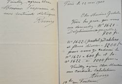 François Rivoire (Lyon, 1842/1919)Dans cette lettre, le peintre de fleurs François Rivoire donne le prix de ses oeuvres à M. Gadala, collectionneur : « Voici les prix que vous me demandez. N°1621 Delphiniums (aquarelle) 700 fr. N°1622 (pastel) Dahlias et fleurs diverses 1200 fr. Pour vous, je céderai le n°1621 à 600 Fr et le n°1622 à 1000 francs. » Ces oeuvres étaient manifestement présentées à une exposition, peut-être le Salon. Dans une seconde lettre, il indique qu'il a expédié comme convenu son pastel : « J'ai fait expédié comme vous me l'avez dit mon pastel du Salon à Monsieur Delâtre à Tours. Je l'ai fait emballer avec beaucoup de soin depuis les premiers jours de juillet. J'espère qu'il est arrivé en bon état. Quant à l'aquarelle, elle est toujours à l'atelier et comme je dois partir à la campagne le 1er août vous me direz je vous prie si je dois la livrer avant ou à mon retour au commencement de septembre. »
