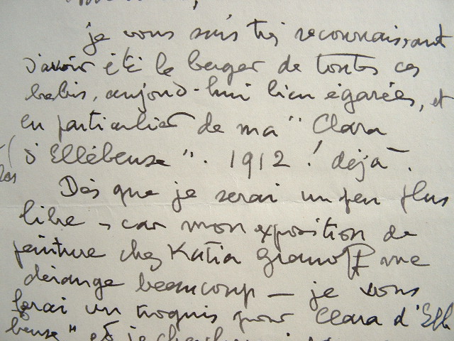 «Je vous suis très reconnaissant d'avoir été le berger de toutes ces brebis, aujourd'hui bien égarées, et en particulier de ma "Clara d'Ellébeuse" [de Francis Jammes], recherché par les bibliophiles. 1912 ! déjà». Il évoque son exposition. «Dès que je serai un peu plus libre - car mon exposition de peinture chez Katia Granoff me dérange beaucoup - je vous ferai un croquis pour Clara d'Ellébeuse et je chercherai dans mes cartons un autre compagnon [...]».