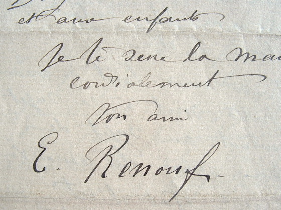 Emile Renouf (Paris, 1845/1894)Emile Renouf vient de recevoir une lettre de Jale l'informant que son atelier de Paris est dans un état épouvantable et qu'il y pleut à l'intérieur. Or, le nouvel atelier qu'il fait construire au Havre, ne sera prêt que dans 3 ou 4 mois. «Fais donc faire le plus stricte nécessaire pour que l'atelier de Paris ne souffre pas trop, j'entends pour que les choses qu'il contient ne souffrent pas car l'atelier, je m'en fous. Va à l'atelier le plus tôt possible et vois ce qui se passe, déplace ce qui pourrait être mouillé et arrange-toi pour que la porte soit fermée». Il ne peut se rendre lui-même à Paris, étant handicapé par sa jambe. «Je suppose que tu as livré sans ennui le tableau Niagara à Me Wentworth, car je n'ai plus entendu parler d'elle [...]».