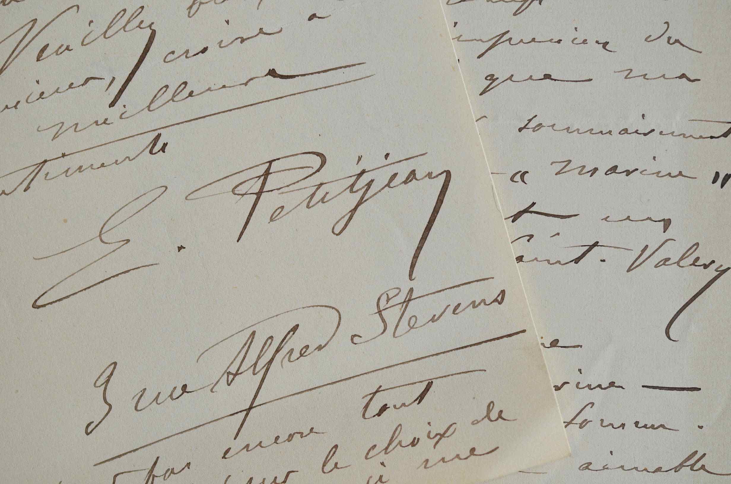 Dans ces deux lettres, le peintre Edmond-Marie Petitjean s'entretient avec son confrère Georges de Dramard au sujet de l'exposition de l'un de ses tableaux à Monte-Carlo : «N'étant pas encore tout à fait fixé sur le choix de la marine, je me contente de désigner cette toile d'une façon générale, l'envoi de la notice étant urgent. Mais je pourrai dans quelques jours vous donner de plus précises explications que vous pourrez transmettre à l'amateur si ce rare oiseau se met à voleter autour de ce tableau.» En effet, Petitjean donne des précisions dans sa seconde lettre : «Je me hâte de vous informer (peut-être sera-t-il encore temps pour l'impression du catalogue) que ma toile baptisée sommairement du nom de "Marine" a pour sujet [...] Saint-Valéry-sur-Somme.» (La princesse Alice de Grimaldi qui avait chargé Georges de Dramard, familier avec l'organisation d'expositions, de préparer un événement annuel au Palais des Beaux-Arts de Monte-Carlo).