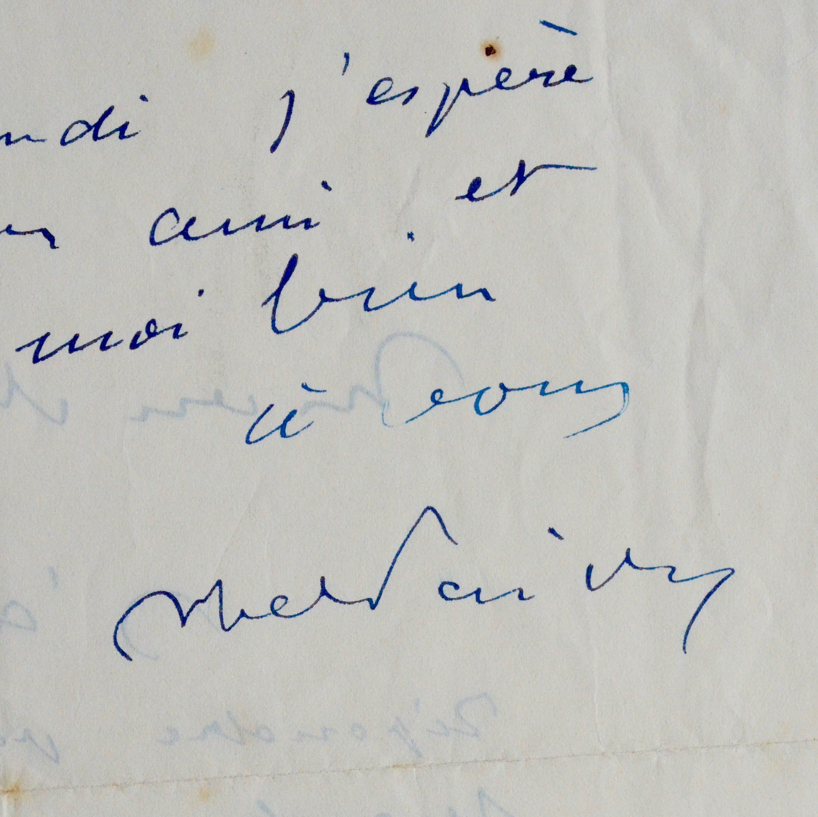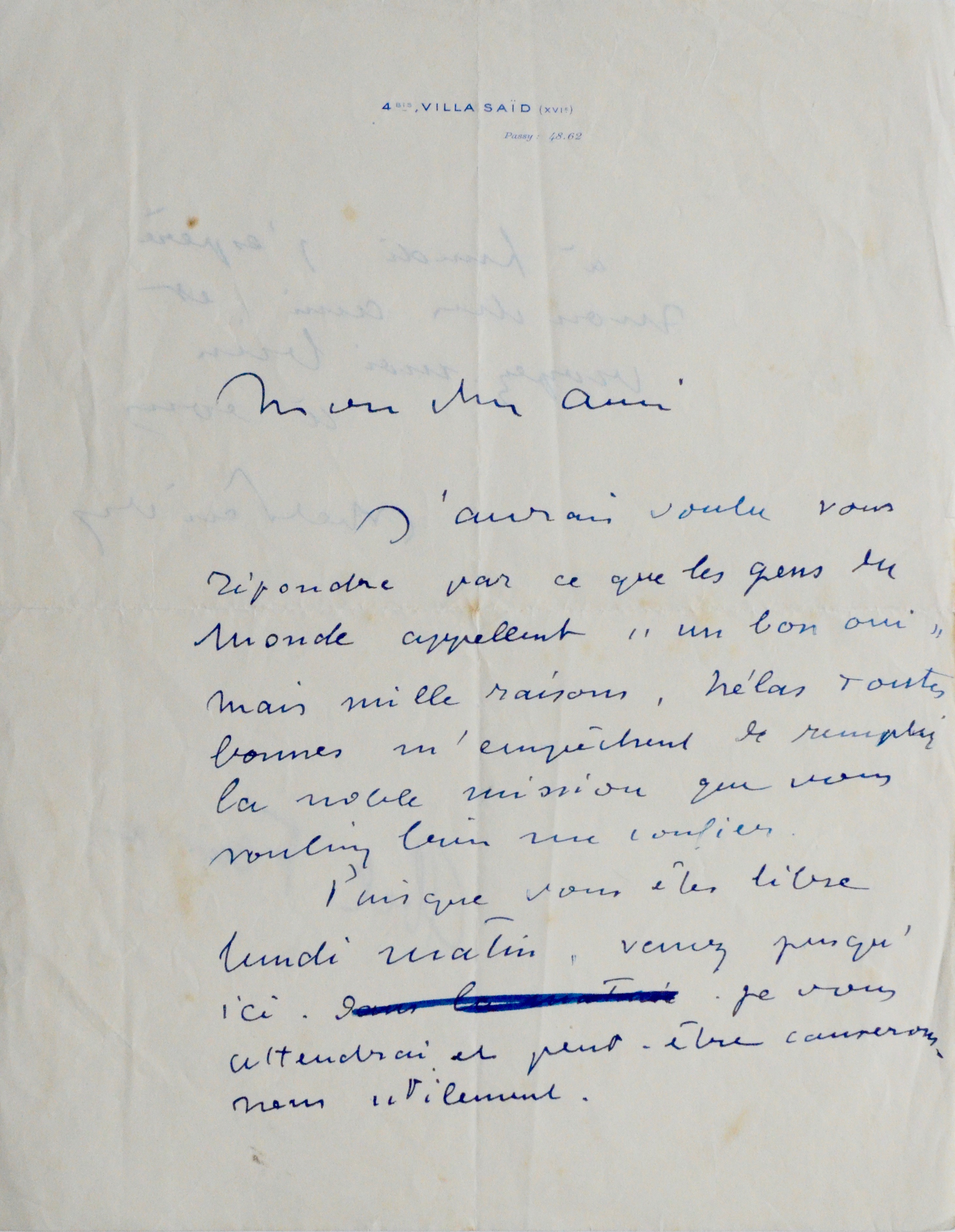 Encre bleue sur papier filigrané "BFK Rives". Adresse imprimée en tête "4bis villa Saïd".