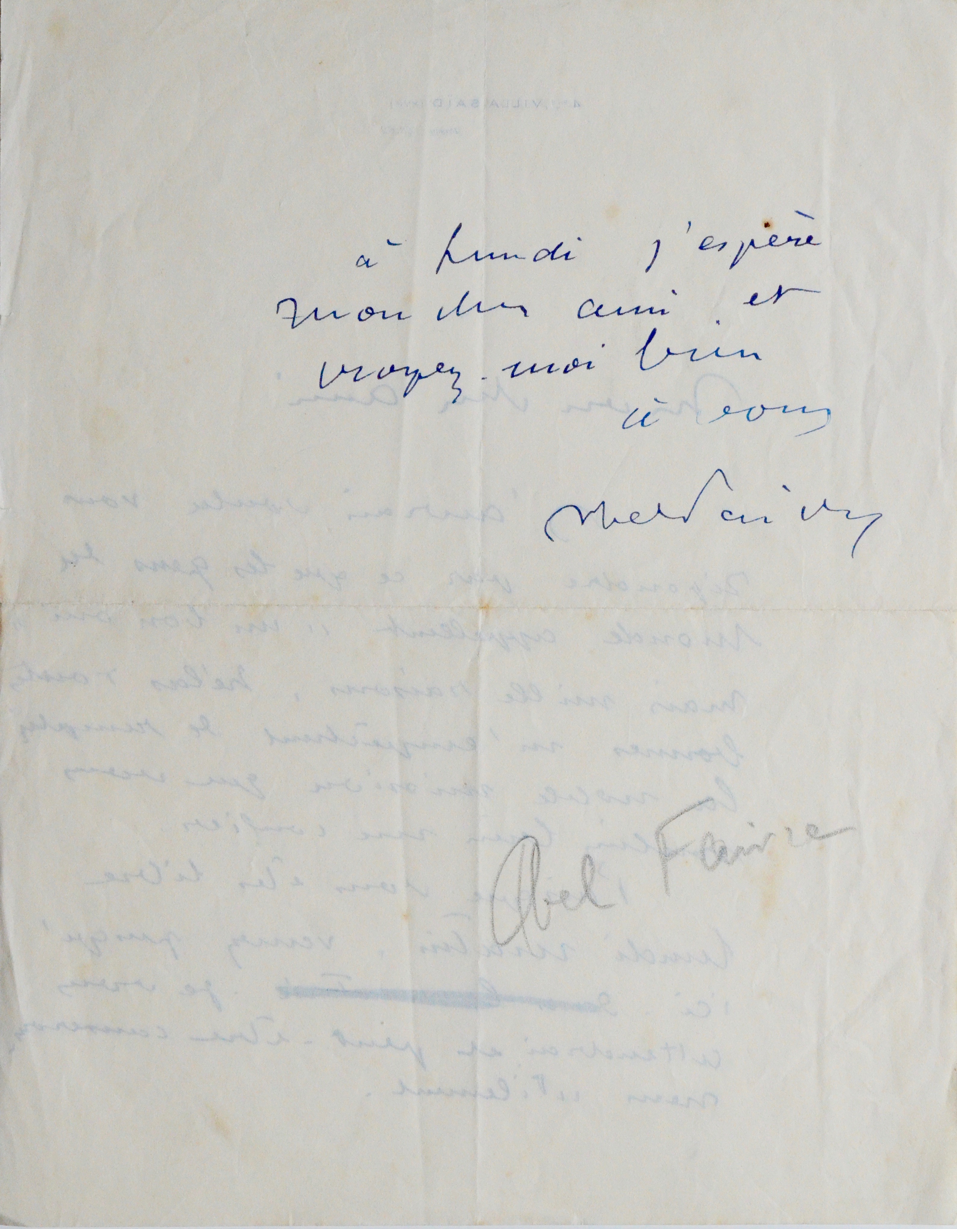 Lettre du peintre, affichiste et caricaturiste Abel Faivre : "J'aurais voulu vous répondre par ce que les gens du monde appellent "un bon oui" mais mille raisons, hélas toutes bonnes m'empêchent de remplir la noble mission que vous vouliez bien me confier [...]". Il donne rendez-vous à son ami pour "causer utilement".