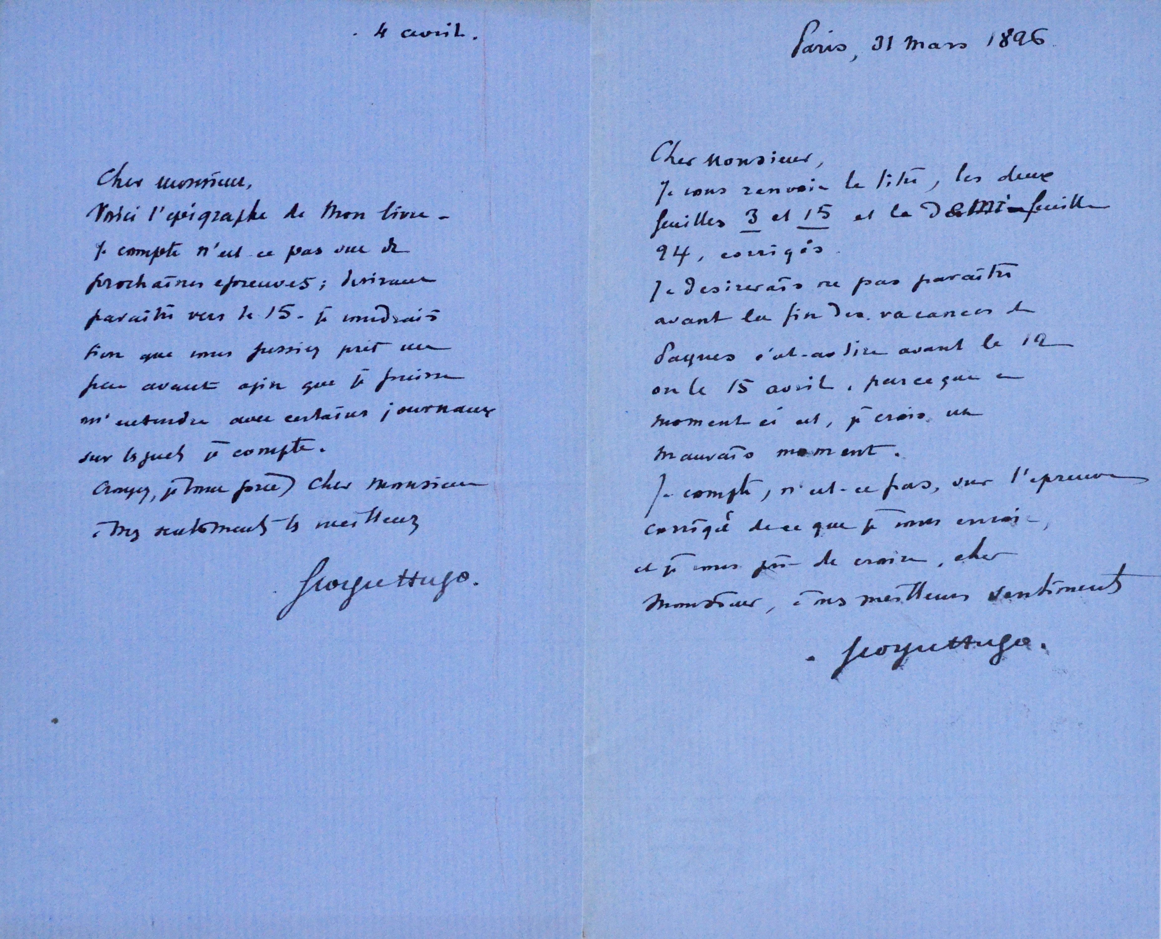 "Je vous renvoie le titre, les deux feuilles 3 et 15 et la demi-feuille 24, corrigés. Je désirerais ne pas paraître avant la fin des vacances de Pâques [...]". "Voici l'épigraphe de mon livre. Je compte n'est ce pas sur de prochaines épreuves ; désirant paraître vers le 15, je voudrais bien que vous fussiez prêt un peu avant afin que je puisse m'entendre avec certains journaux sur lesquels je compte [...]".