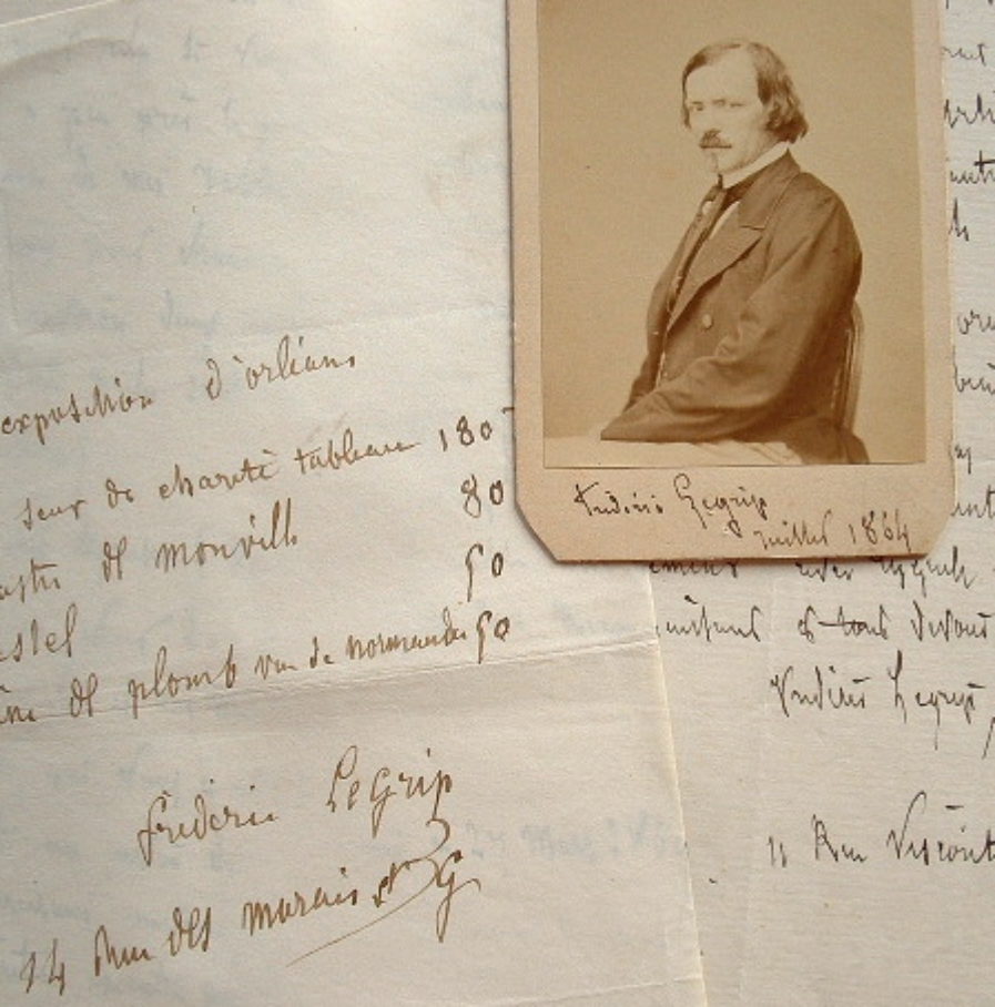 Frédéric Legrip (Rouen, 1817/1871)Frédéric Legrip tient à prendre part à la prochaine exposition artistique de Rouen ; dans cette optique, il fait remettre deux paysages à Gustave Morin, plus un troisième tableau qui se trouve chez son frère. «Je vous désigne ici à peu près le prix que je désirerais obtenir pour chacun de mes tableaux, trois cents à trois cent vingt francs pour chacun de mes plus grands paysages et environ deux cent vingt pour le plus petit (ces trois toiles sont les études même peintes d'après nature». Il fait appel à son «utile bienveillance» pour les prochaines expositions de la Société des Amis des Arts, et recommande un graveur, M. Péquignot. Sur un second feuillet, Frédéric Legrip note le prix de differentes oeuvres pour l'exposition d'Orléans. Avec un portrait photographique de Legrip par Richebourg (juillet 1864).