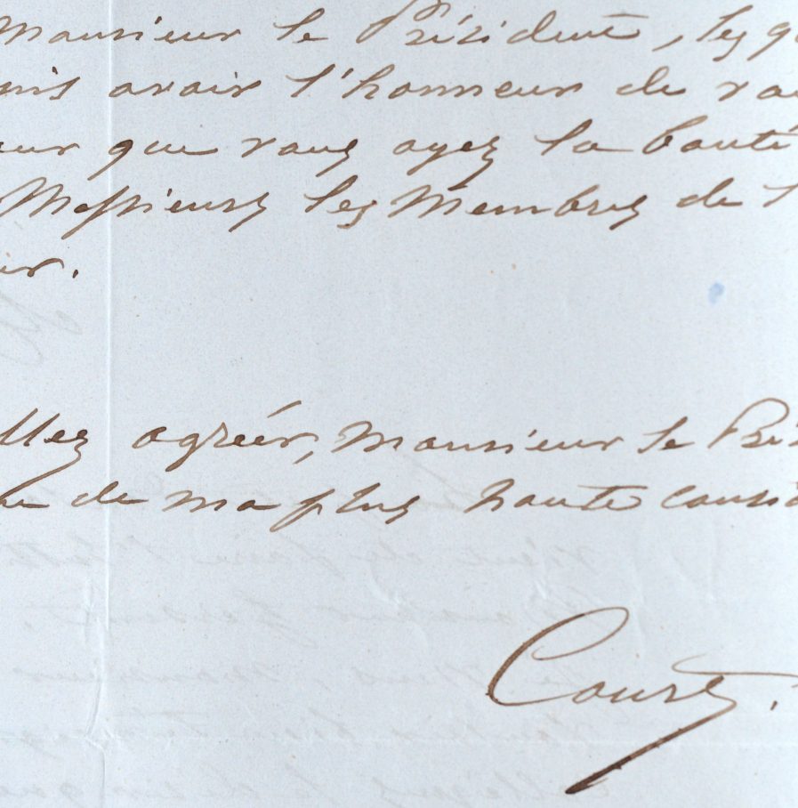 Par cette lettre, le peintre Joseph-Désiré Court présente sa candidature à l'Académie des Beaux-arts, au fauteuil de Louis Hersent, décédé quelques semaines plus tôt, le 2 octobre. Il met en avant ses dernières oeuvres, en particulier le tableau intitulé : "La Commission du musée Napoléon présentant à leurs majestés impériales les plans du musée d'Amiens". [Emile Signol lui sera finalement préféré].