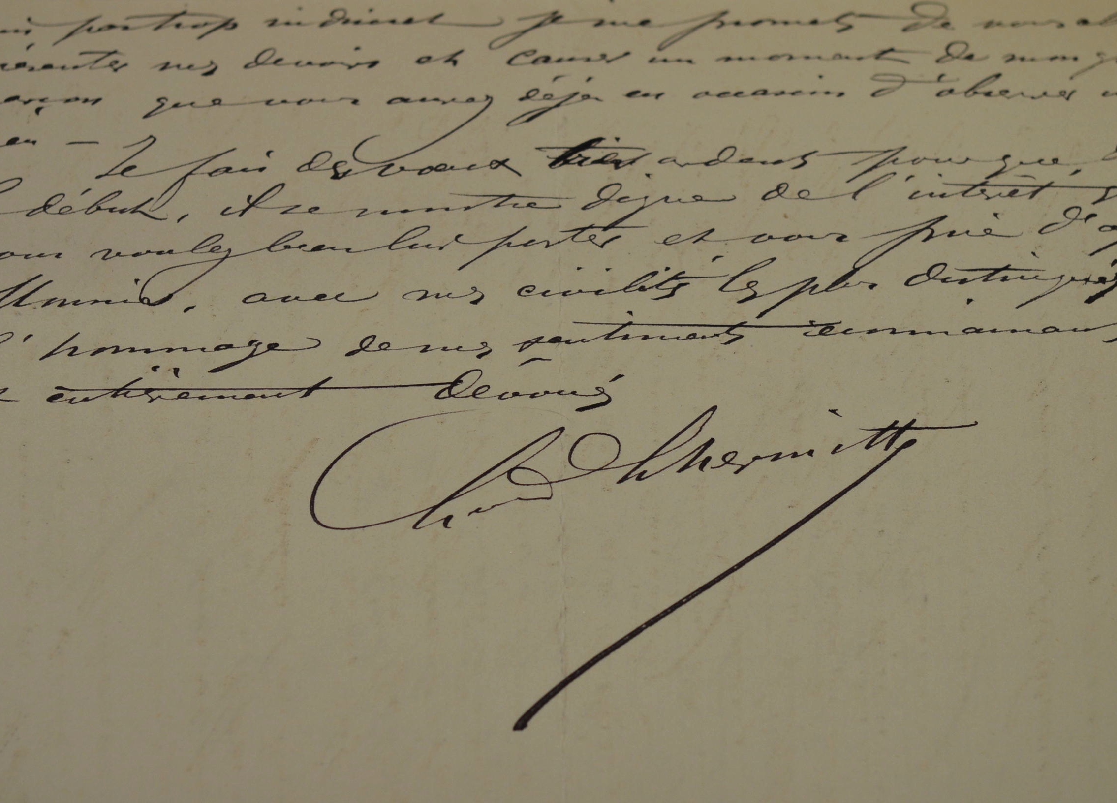 Léon Lhermitte (Mont-Saint-Père , 1844/1925)Lettre de Léon Lhermitte relative à la formation de son fils Charles. [Charles Lhermitte (1881/1945) fut photographe ; Camille Claudel réalisa son buste en 1889 ; Léon Lhermitte fut très lié à Rodin]. "Tout d'abord, je tiens à vous dire combien j'ai été touché des termes par lesquels vous avez bien voulu répondre à ma récente lettre. Tout en déplorant qu'il ne vous soit point possible de vous charger vous-même de mon fils, je considère comme précieux les indications que vous m'adressez confidentiellement et qui sont pour moi décisives. Charles entrera donc demain soit chez monsieur Estève, lequel s'est d'ailleurs montré plein de sollicitude à son endroit [...]. A la façon dont mon fils a ressenti de chagrin du départ de son ancien professeur, il est visible qu'il est loin d'être insensible aux soins dont il est l'objet. Et si, comme vous voulez bien me le dire, Monsieur, vous consentez à lui témoigner un peu de sympathie, je puis vous assurer en échange un véritable attachement de la part de votre futur élève et (ai-je besoin de vous le déclarer) de la mienne la plus entière reconnaissance [...]".