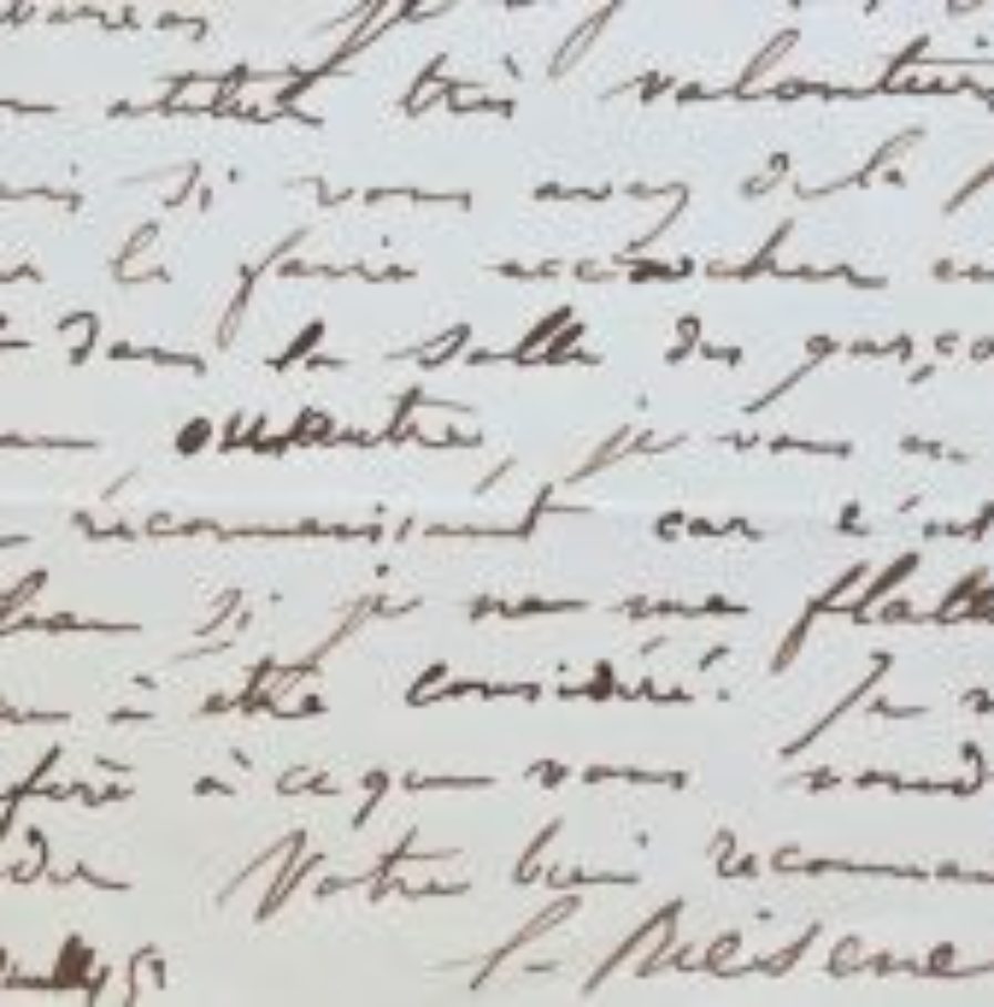 Dans cette lettre empressée, le peintre Léon Riesener annonce à son correspondant qu'il a terminé la commande du Ministre : « Vous verrez bien sur la lettre d'avis de ma commande que j'étais invité à envoyer le tableau au Ministre le plus tôt. Toutefois s'il vous était un embarras je le garderais dans mon atelier très volontiers. Mais si vous avez de la place pour le faire accrocher en vue soit dans la salle du garçon de bureau, ou autre, je vous en serais bien reconnaissant car c'est un tableau si je ne me flatte qui gagne à être considéré. »