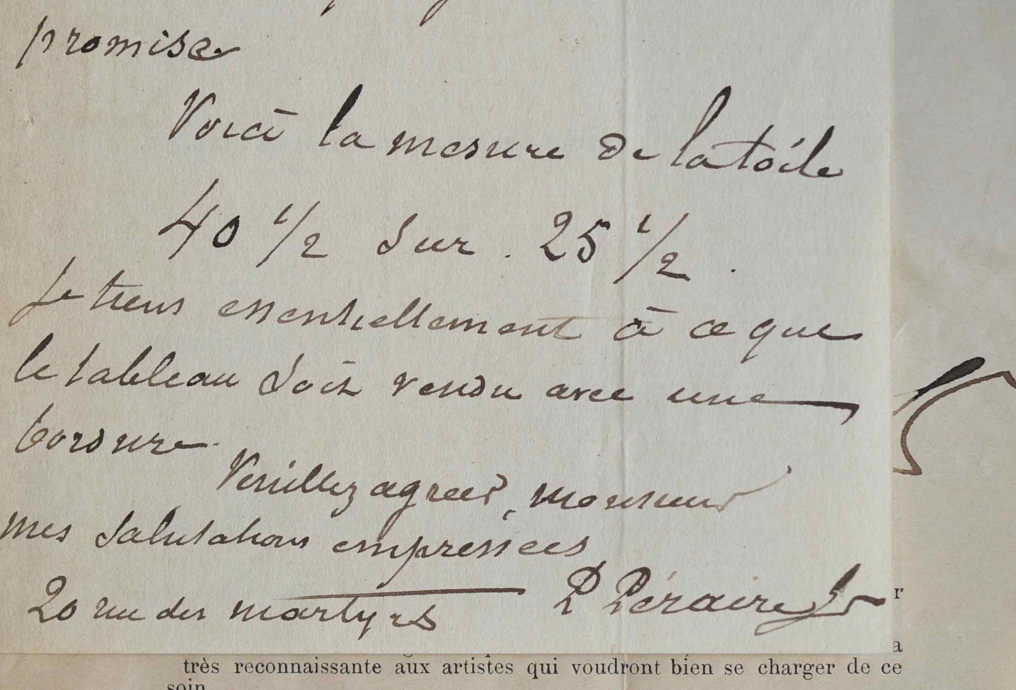 Paul Péraire (Bordeaux, 1829/1893)Le peintre Paul Péraire termine une toile pour la Société Arti et Amicitae et demande à son Directeur de lui préparer un cadre : «Je viens vous prier de m'envoyer le plus tôt possible un cadre afin que je termine la toile que je destine à la Société et que je vous ai promise. Voici la mesure de la toile 40 ½ sur 25 ½ . Je tiens essentiellement à ce que le tableau soit vendu avec une dorure.» (La Société Arti et Amicitae avait été fondée à Amsterdam en 1839 et avait pour but de promouvoir les arts et les artistes). Est jointe une note imprimée à adresser à MM. Les Présidents de la Société Arti et Amicitae (collée à la lettre), en vue de la publication du catalogue ; elle porte, de la main de Péraire, le titre de l'oeuvre, Bords de la Seine, sa nature, Peinture ainsi que la signature et l'adresse de l'artiste.