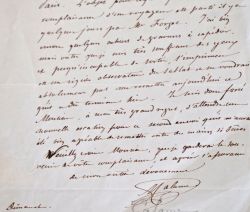 Alexandre Calame (Corsier-sur-Vevey, 1810/1864)Alexandre Calame remercie son correspondant pour ses offres de service pour Paris, et l'entretient de l'envoi de gravures. "L'objet pour lequel j'ai sollicité la complaisance d'un voyageur est parti il y a quelques jours par Mr Forget. J'ai bien encore quelques cahiers de gravures à expédier, mais outre que je suis très souffrant des yeux et presqu'incapable de sortir, l'imprimeur est un rigide observateur du sabbat et ne voudrait absolument pas me remettre aujourd'hui ce qu'il a dû terminer hier. Je suis donc forcé, monsieur, à mon très grand regret, d'attendre une nouvelle occasion pour ce second envoi qu'il m'aurait été bien agréable de remettre entre des mains si sûres [...]".
