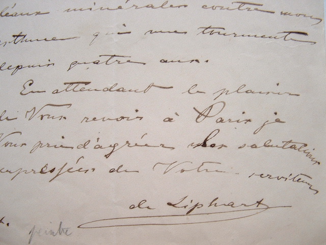 «A mon prochain retour à Paris, je ferai avec grand plaisir les retouches désirées au portrait de M. Bougereau [Bouguereau ?]. Je tente ici une cure d'eaux minérales contre mon asthme qui me tourmente depuis quatre ans [...]».