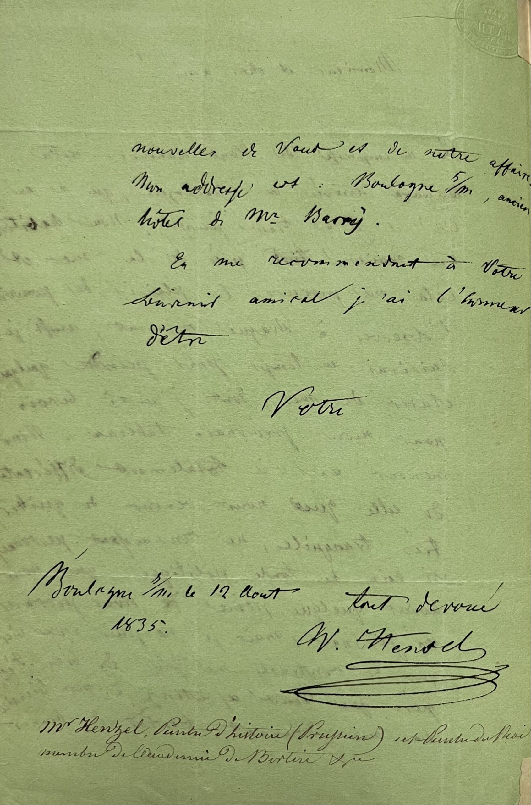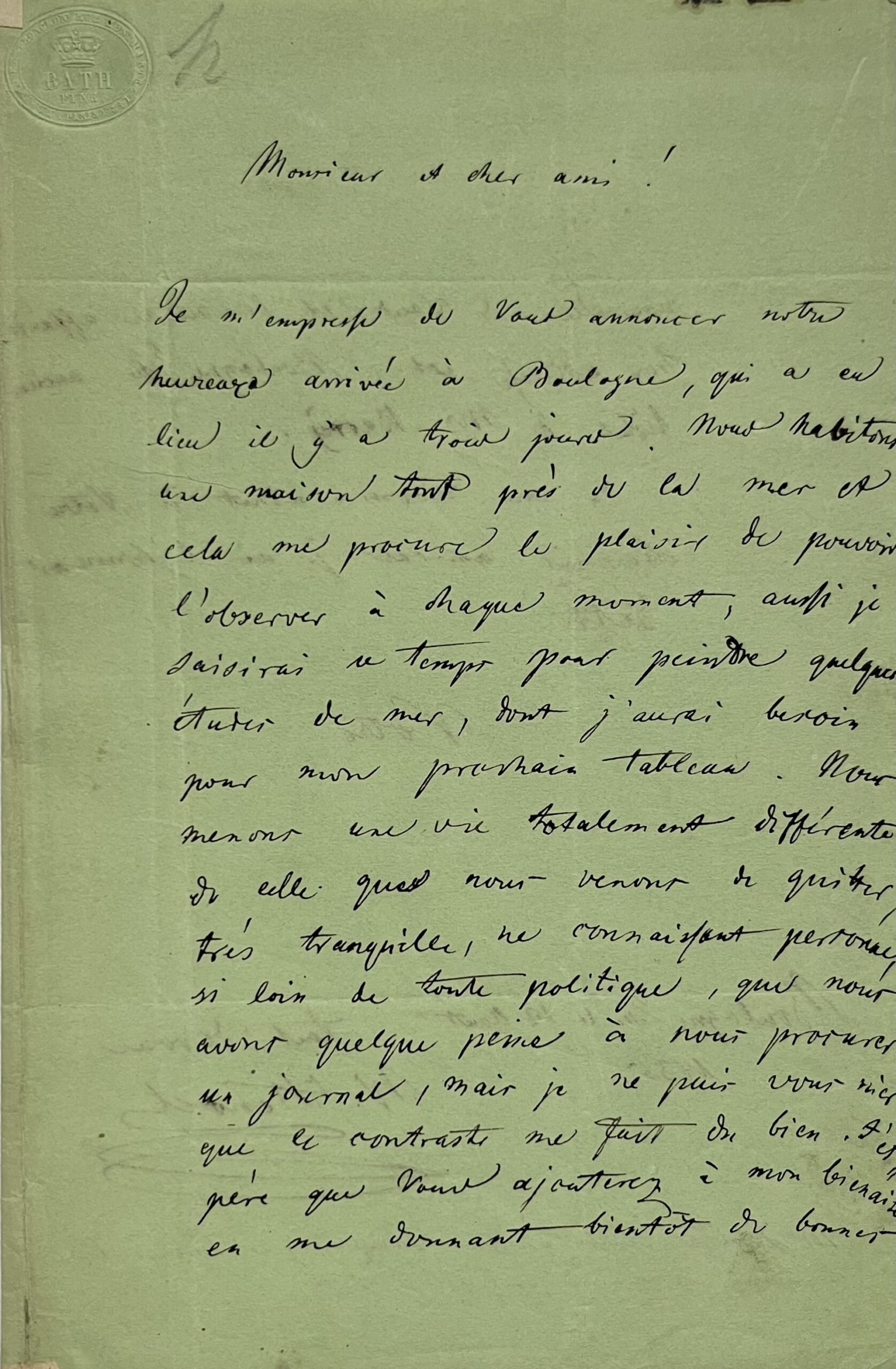 "Monsieur et cher ami ! Je m’empresse de vous annoncer notre heureuse arrivée à Boulogne, qui a eu lieu il y a trois jours. Nous habitons une maison tout près de la mer et cela me procure le plaisir de pouvoir l’observer à chaque moment, aussi je saisirai ce temps pour peindre quelques études de mer, dont j’aurai besoin pour mon prochain tableau. Nous menons une vie totalement différente de celle que nous venons de quitter, très tranquille, ne connaissant personne, si loin de toute politique, que nous avons quelque peine à nous procurer un journal, mais je ne puis vous nier que le contraste me fait du bien. J’espère que vous ajouterez à mon bienaise en me donnant bientôt de bonnes nouvelles de vous et de votre affaire". Il lui donne son adresse à Boulogne".