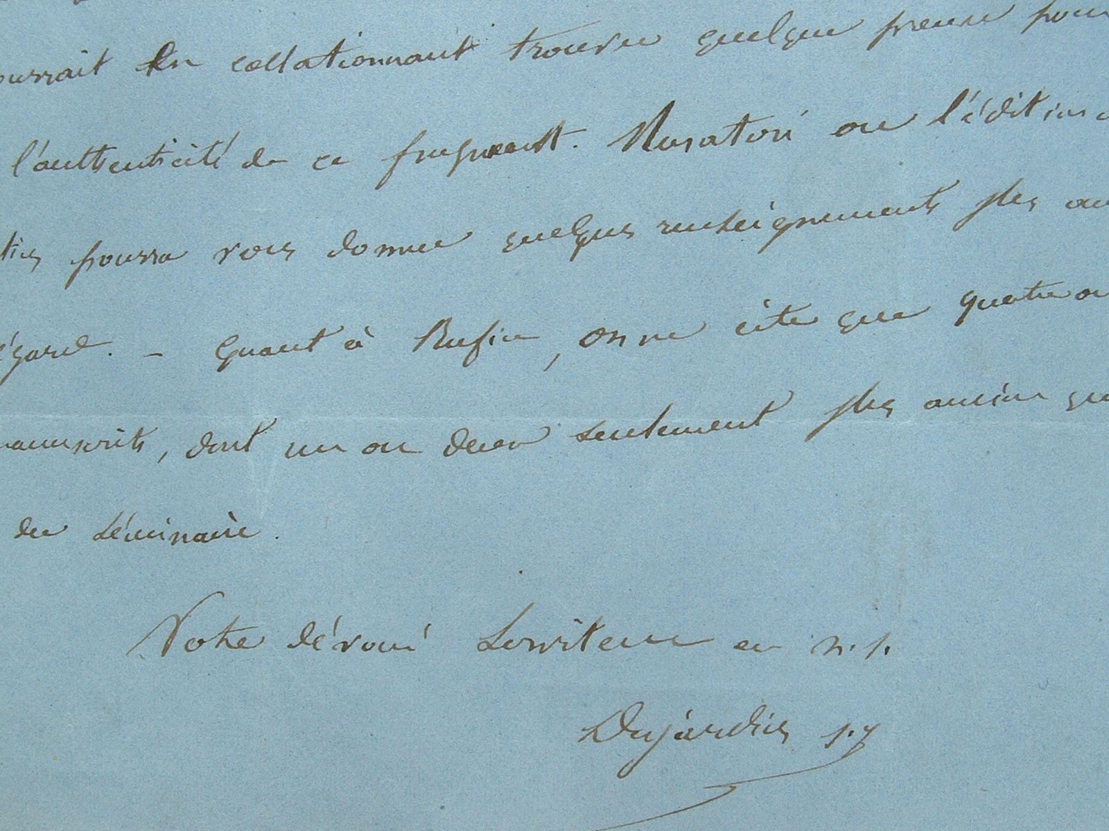 Au sujet d'une recherche dans les manuscrits du séminaire : «on pourrait, en collationnant, trouver quelque preuve pour ou contre l'authenticité de ce fragment».