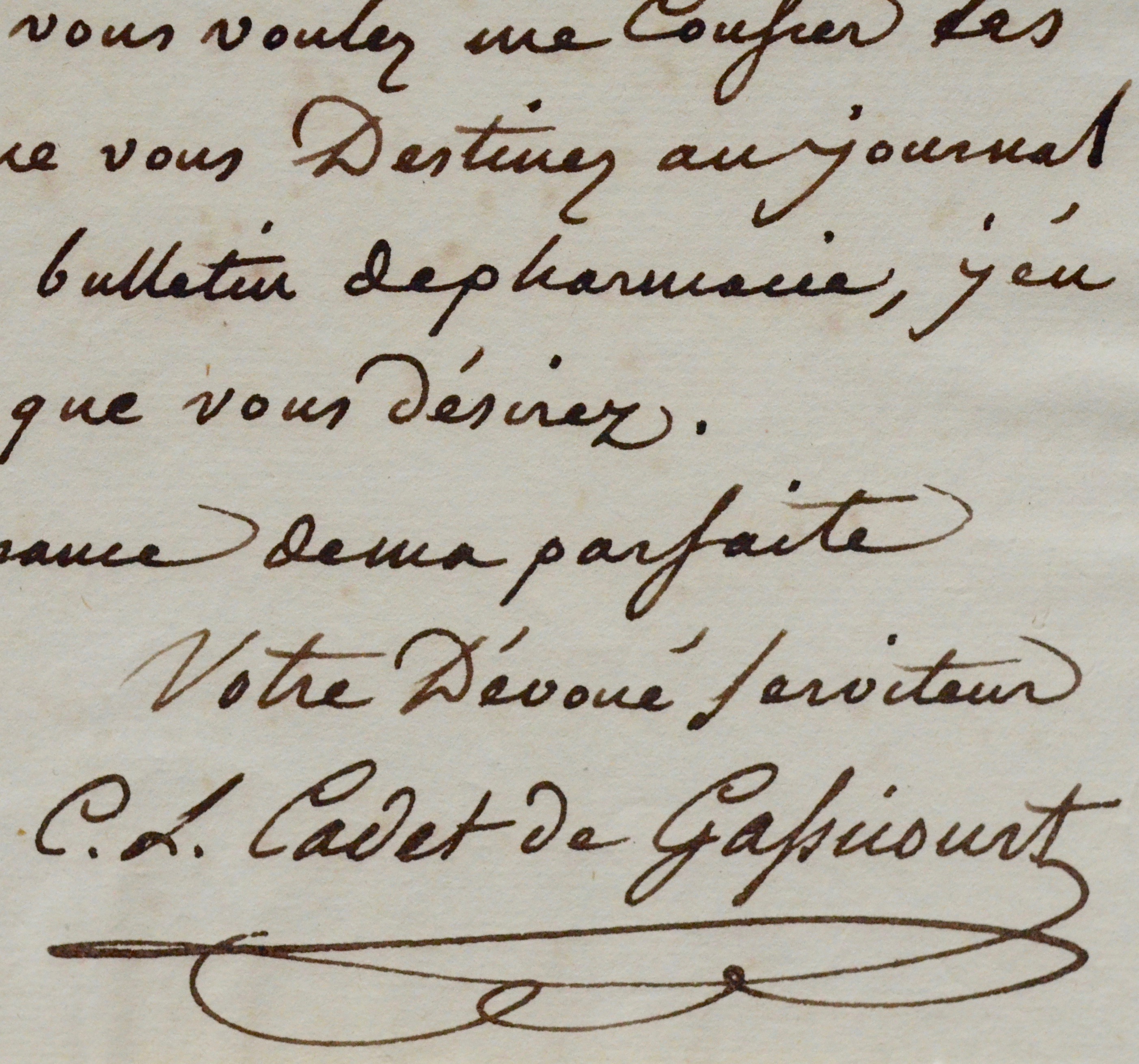 Charles Cadet de Gassicourt (Paris, 1769/1821)Charles-Louis Cadet de Gassicourt fait parvenir deux rapports à "l'assemblée du Conseil d'administration [...] avec les échantillons de Moiré que vous m'avez transmis". Il ajoute "J'ai reçu à l'adresse de M. Salverte un exemplaire de votre notice. Je la lui ai fait passer à Genève. Je n'en ai pas reçu à mon adresse et vous m'obligerez de m'en envoyer. Si vous voulez me confier les exemplaires que vous destinez au journal de Paris et au bulletin de Pharmacie, j'en ferai l'usage que vous désirez [...]".
