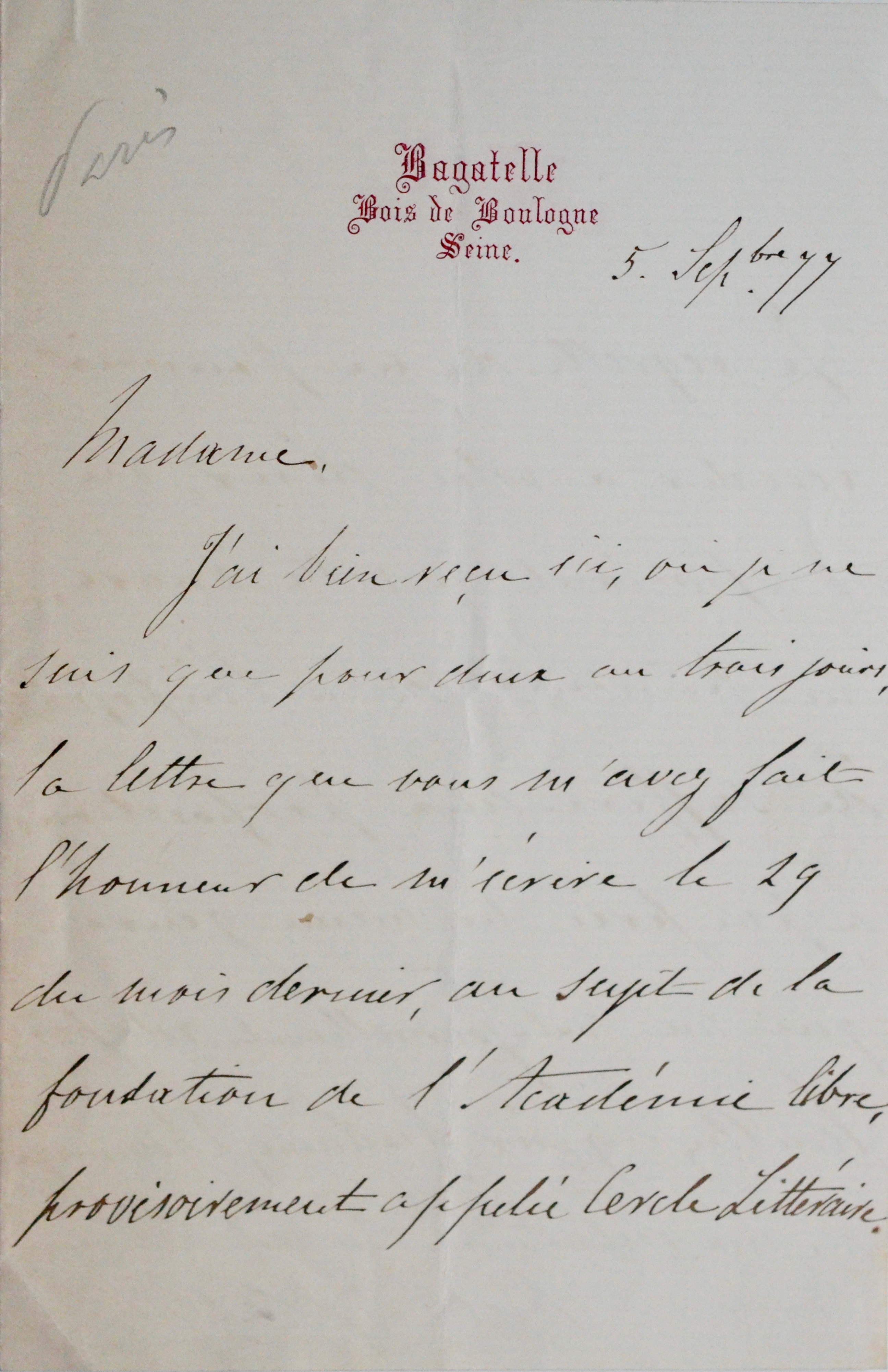 Encre noire sur feuillet double de papier vergé. En-tête bordeaux "Bagatelle Bois de Boulogne Seine".