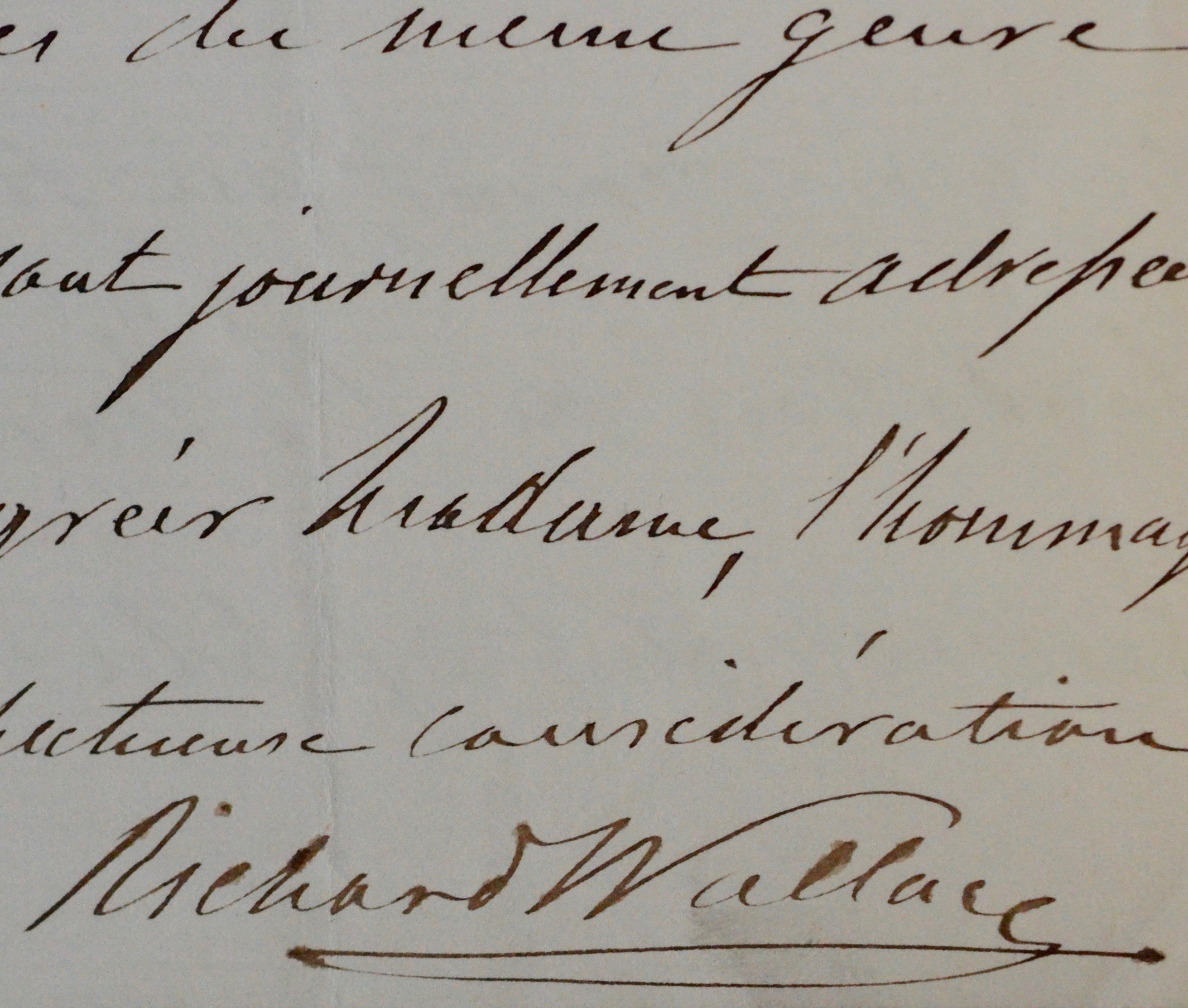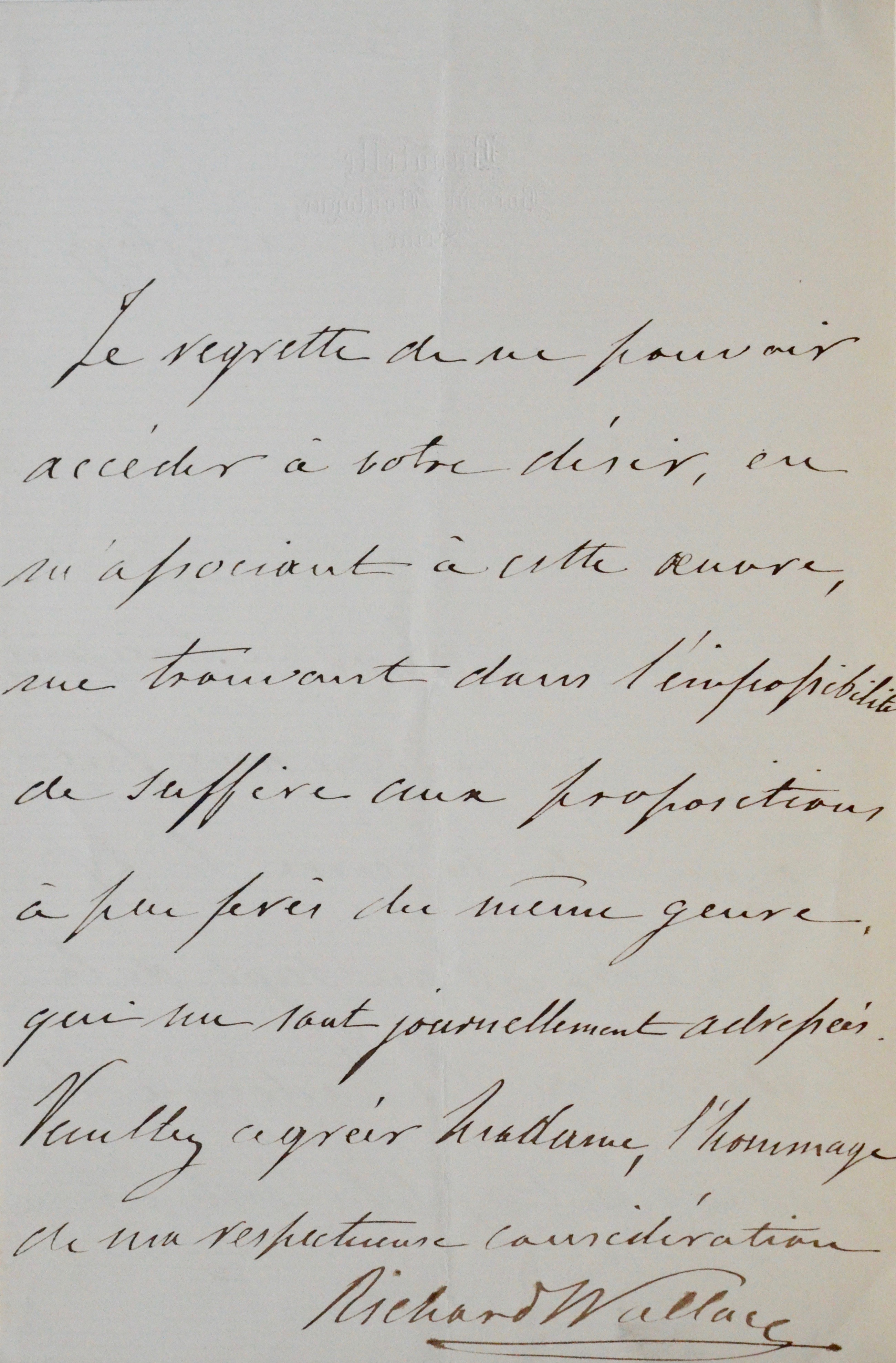 Lettre du riche collectionneur et philanthrope Richard Wallace, en français. Il évoque la "fondation de l'Académie libre, provisoirement appelée Cercle littéraire", et refuse d'y participer : "Je regrette de ne pouvoir accéder à votre désir, en m'associant à cette oeuvre, me trouvant dans l'impossibilité de suffire aux propositions à peu près du même genre, qui me sont journellement adressées [...]".