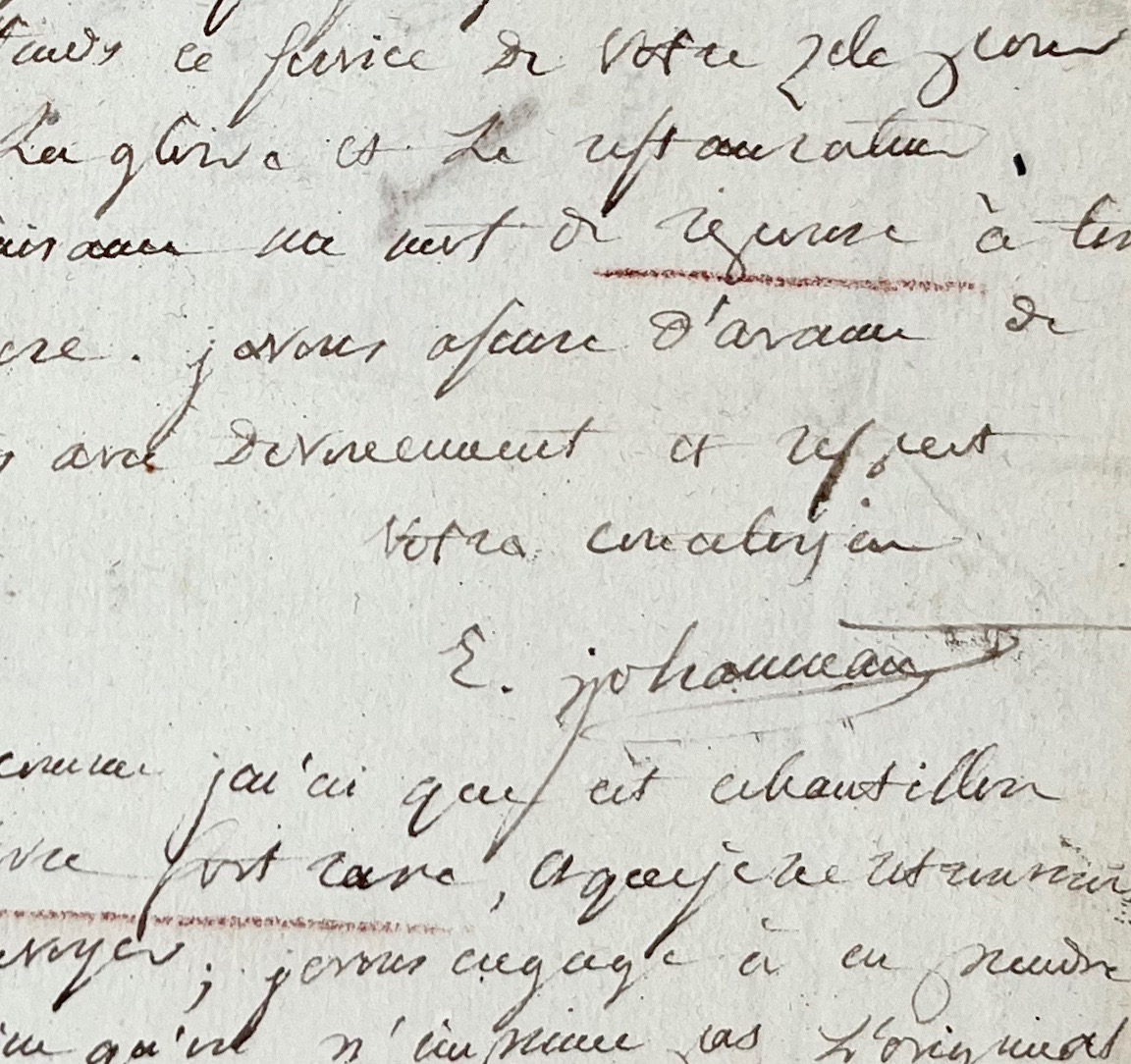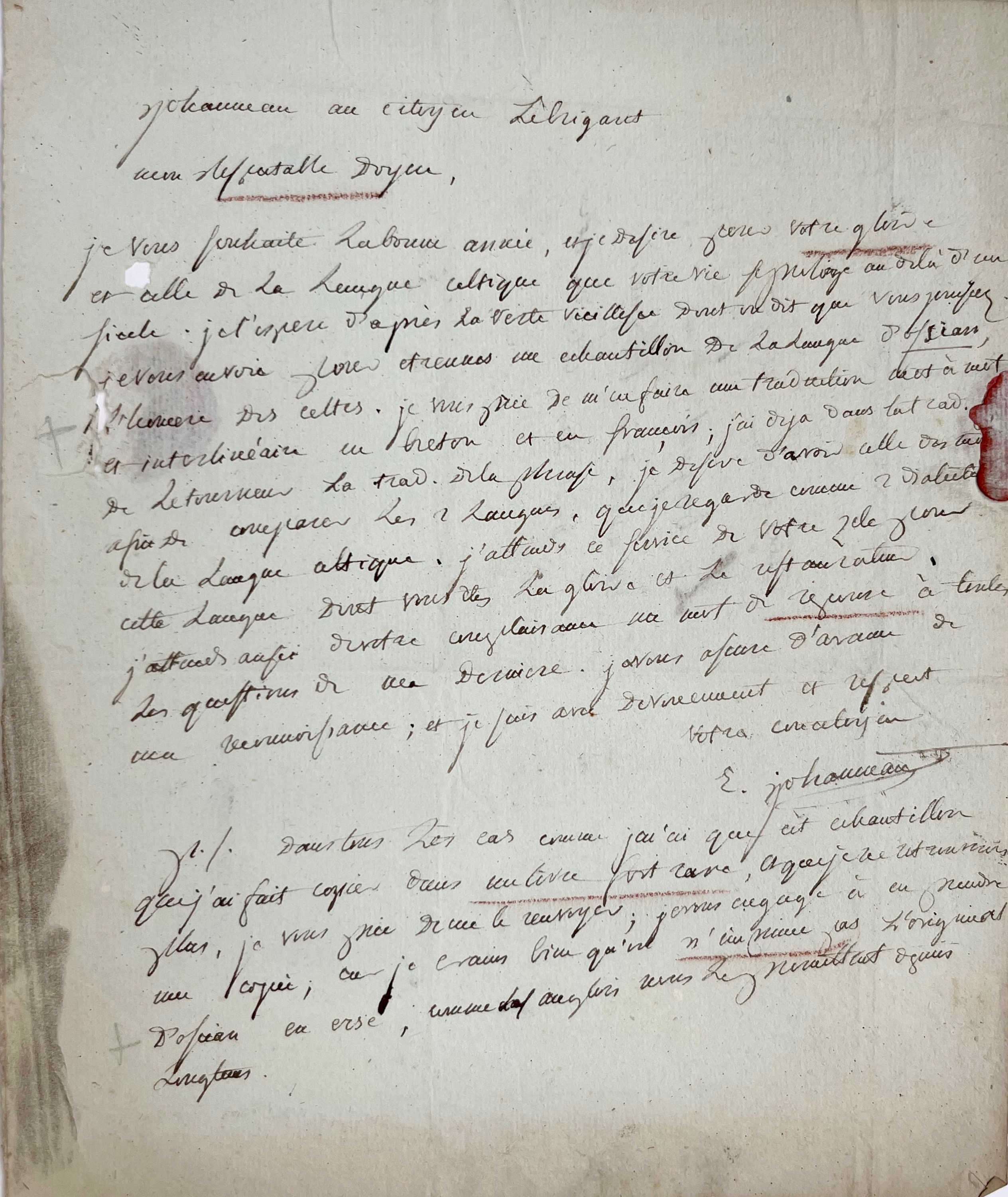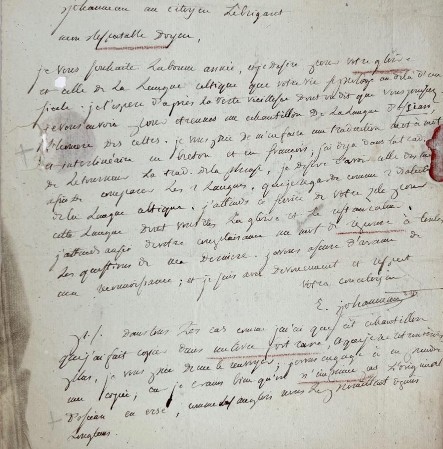 « Mon respectable doyen […], je désire pour votre gloire et celle de la langue celtique que votre vie se prolonge au-delà d’un siècle […]. Je vous envoie pour étrennes un échantillon de la langue d’Ossian, si honorée des Celtes. Je vous prie de m’en faire une traduction mot à mot et interlinéaire en breton et en français […] ». Il voudrait comparer les deux langues « que je regarde comme 2 dialectes de la langue celtique. J’attends ce service de votre zèle pour cette langue dont vous êtes la gloire et le restaurateur[…] ».