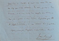 Jean Reynaud (Lyon, 1806/1863)Dans ces lettres au directeur du journal L'Estafette, le philosophe Jean Reynaud évoque notamment ses travaux sur son maître, Merlin de Thionville : « J'ai tenu à remplir la promesse que je vous avais faite [...]. Je vous ai écrit une biographie de Merlin de Thionville, biographie tout à fait inédite, car il n'y a rien d'authentique sur sa vie. » Merlin de Thionville, envoyé en mission par la Moselle à l'Assemblée législative en 1790 et membre du Club des Jacobins, fut le tuteur de Reynaud. En 1860, celui-ci fit paraître une monographie sur le député révolutionnaire. Une lettre recommande également Armand Lévy (1827/1891), journaliste républicain et anticlérical.
