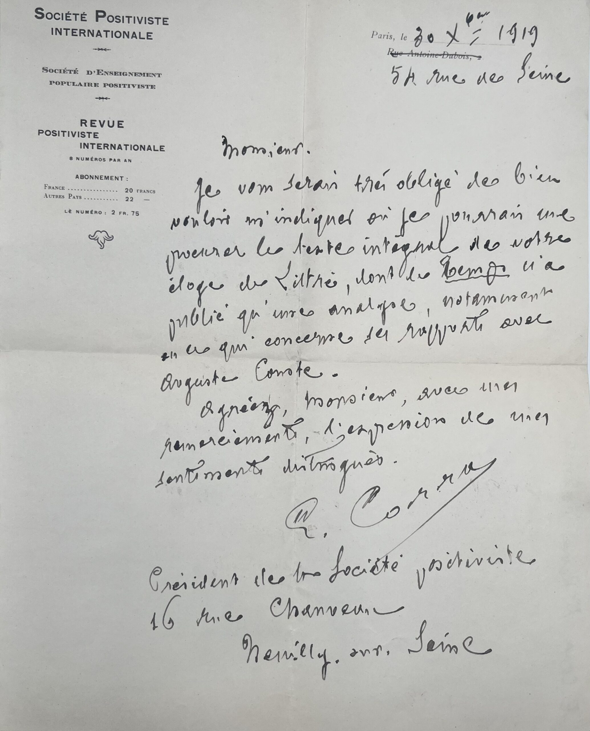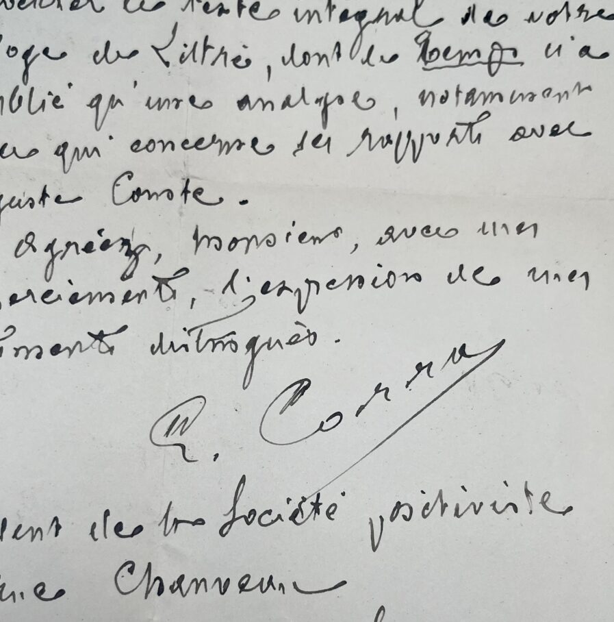 "Monsieur. Je vous serais très obligé de bien vouloir m’indiquer où je pourrais me procurer le texte intégral de votre éloge de Littré, dont le Temps n’a publié qu’une analyse, notamment en ce qui concerne les rapports avec Auguste Comte. Agréer, Monsieur, avec mes remerciements, l’expression de mes sentiments distingués. E. Corra. Président de la société positiviste".