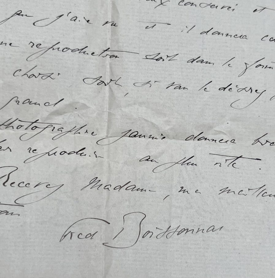 "Le daguerréotype que vous m'avez confié est superbe. C'est un des mieux conservés et des plus beaux que j'aie vu et il donnera certainement une bonne reproduction soit dans un format que vous avez choisi soit si vous le désirez plus tard, en plus grand. La photographie jaunie donnera bien et je la ferai reproduire au plus vite".