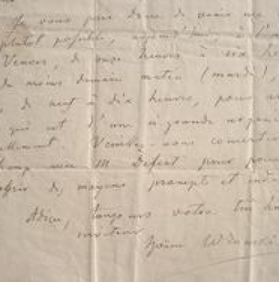 «Précisément au moment où, pour réaliser finalement tous nos préparatifs, il me faut offrir une assistance continue et efficace à tous égards, M. Augé, qui m'avait promis de ne pas quitter Paris avant le terme de ces travaux, vient de partir subitement pour Auxerre». Hoëne-Wronski invite son correspondant à venir le voir au plus vite «pour aviser à ce qui est d'une si grande urgence actuellement». Il conclut : «Veuillez vous concerter sur le champ avec M. Defert pour pouvoir m'offrir des moyens prompts et indispensables». (Lazare Augé (1798/1874) est, pendant vingt ans, le collaborateur de Hoëne-Wronski dont il a publié la biographie).